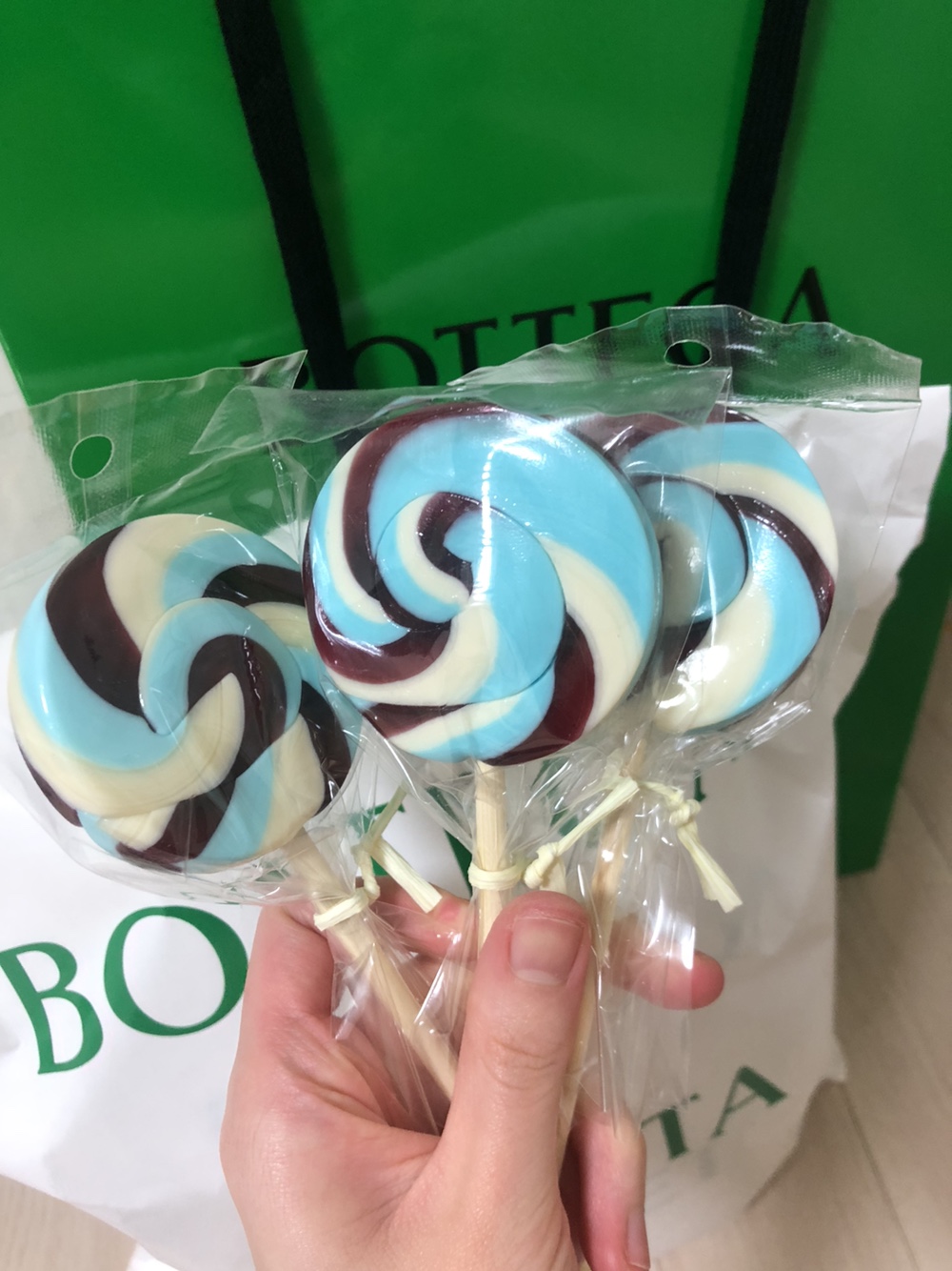 지금 이벤트 기간으로 보테가베네타 제품 구매 시 롤리팝 사탕을 증정하고 있었어요.