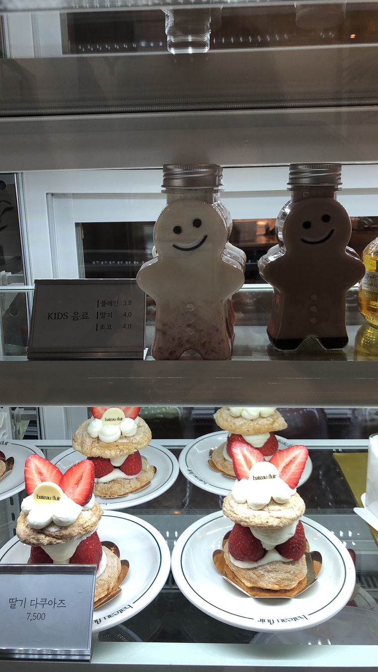 그리고 다양한 케익과 다쿠아즈, 맨위쪽에 스마일맨 모양의 보틀에 담겨진 어린이 음료까지 있었어요.