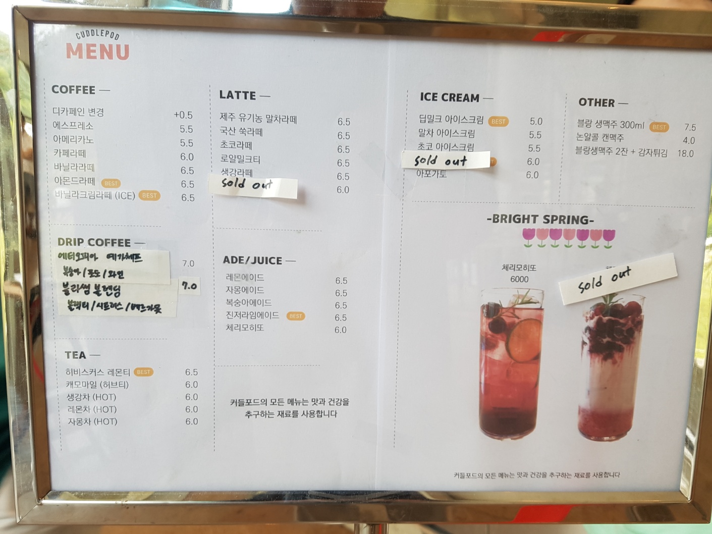 대구 팔공상 커들포드 카페의 메뉴판이에요.
