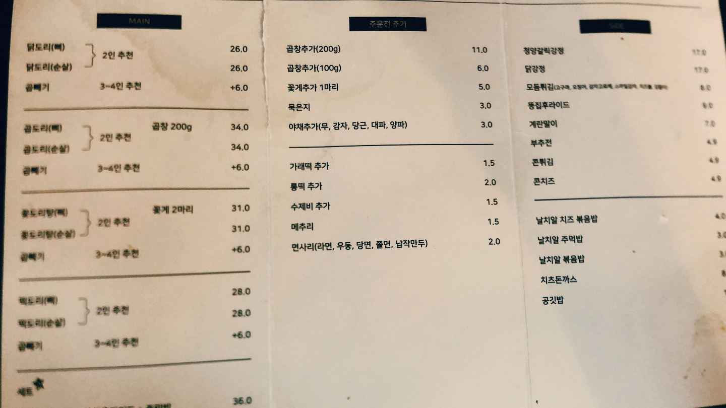 메뉴는 닭도리탕 뼈/순살, 곱창이 들어간 곱도리탕