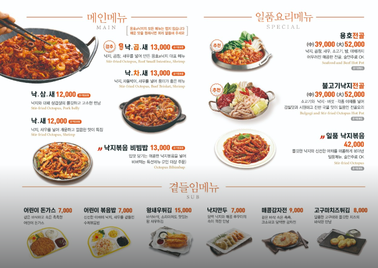 메인메뉴로 낙삼새, 낙새, 낙차새, 낙곱새등