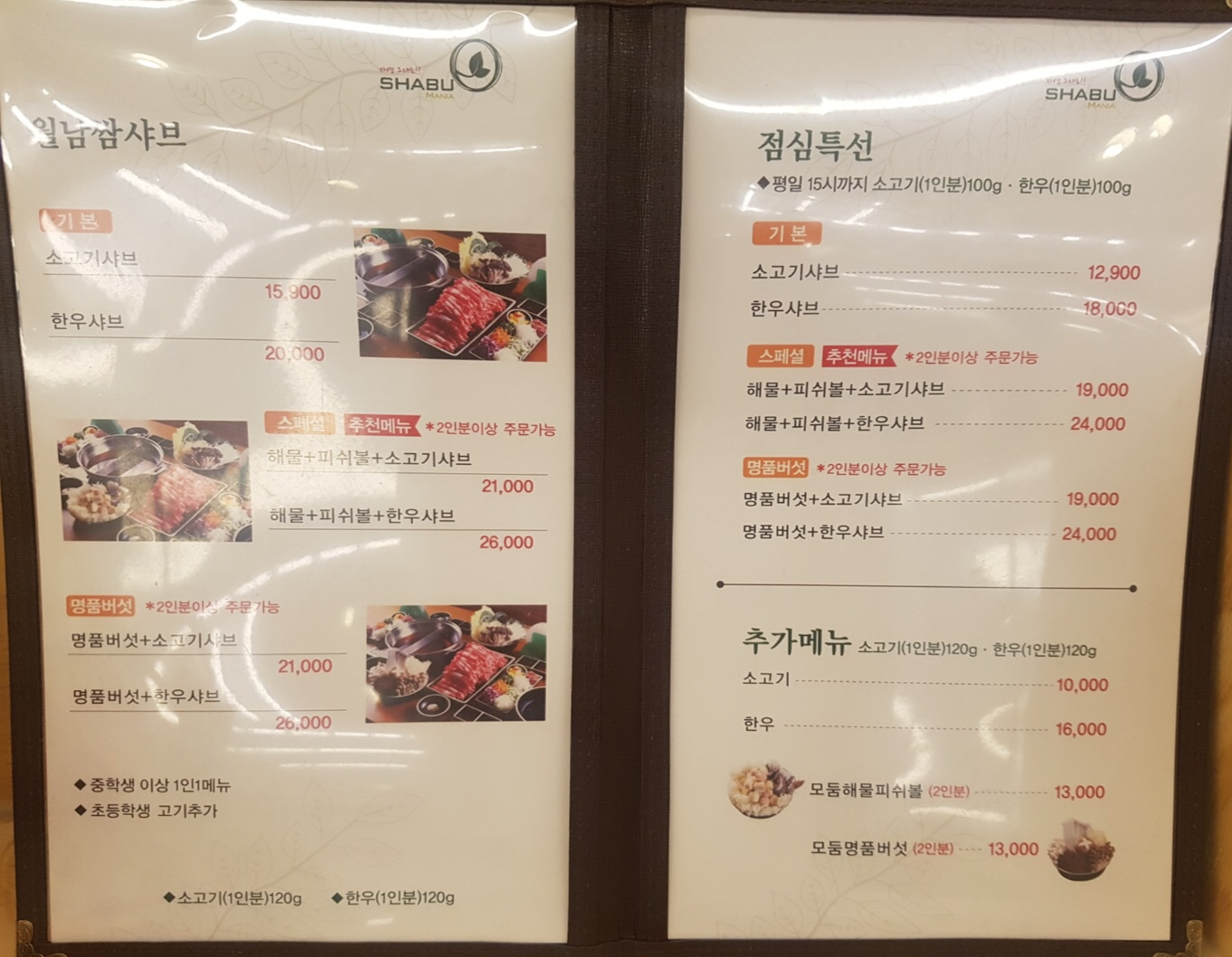 한우 샤브가 1인당 20000원이에요.