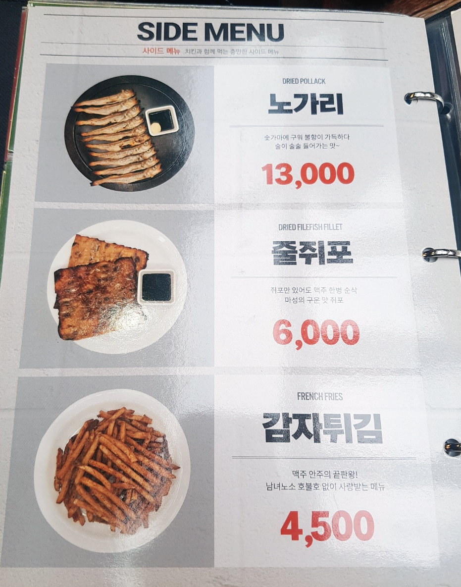 노가리, 줄쥐포, 감자튀김 등 다양한 사이드메뉴가 많아요.