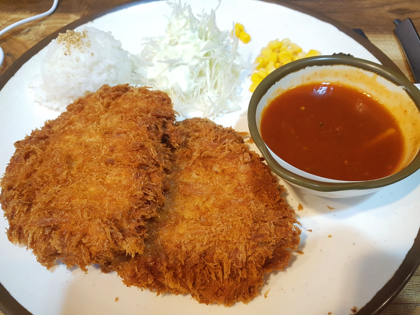 돈까스 2조각과 밥, 양배추샐러드, 피클, 스위트콘
