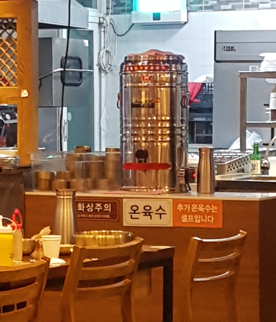 처음에 주문 후 기본셋팅되는 반찬과 함께 온육수를 주시는데, 그 다음 추가로 드시고 싶으실 때는 셀프로 리필해서 드시면 되요. 온육수가 엄청 뜨끈하니 맛이 좋아서 저는 기본 3번은 먹는 것 같아요. ㅎㅎ