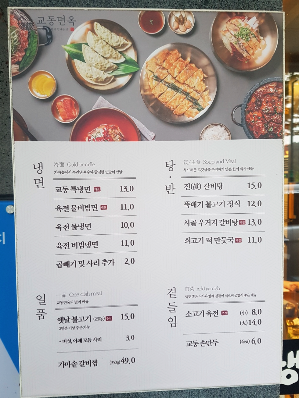 교동면옥을 자주 가시는 분은 무슨 메뉴가 있는지 아시겠지만, 처음가보는 분들도 계실거에요. 냉면과 갈비탕 맛집으로 유명한 교동면옥의 메뉴는 단순하답니다. 냉면과 육전, 불고기, 갈비찜, 갈비탕, 떡만둣국, 손만두 등이 있어요.