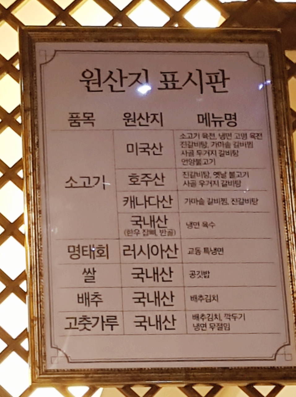 냉면 육수는 국내산 뼈를 사용하였고 고기는 대부분 미국과 호주, 캐나다산 이더라고요.
