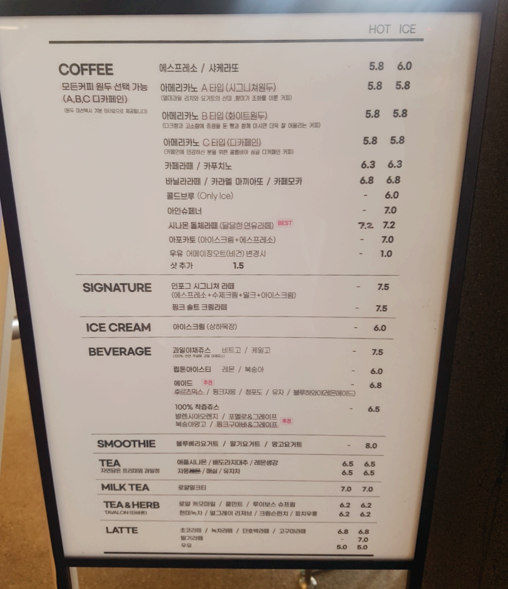 인포그커피의 메뉴판이에요.
