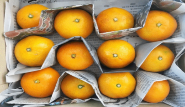 신문지에 귤들이 서로 닿지 않게 포장하신 후