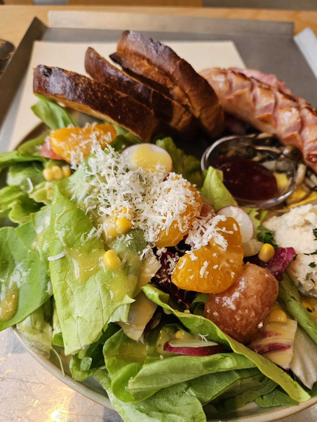 샐러드에는 치즈, 옥수수콘, 귤과 껍질을 벗긴