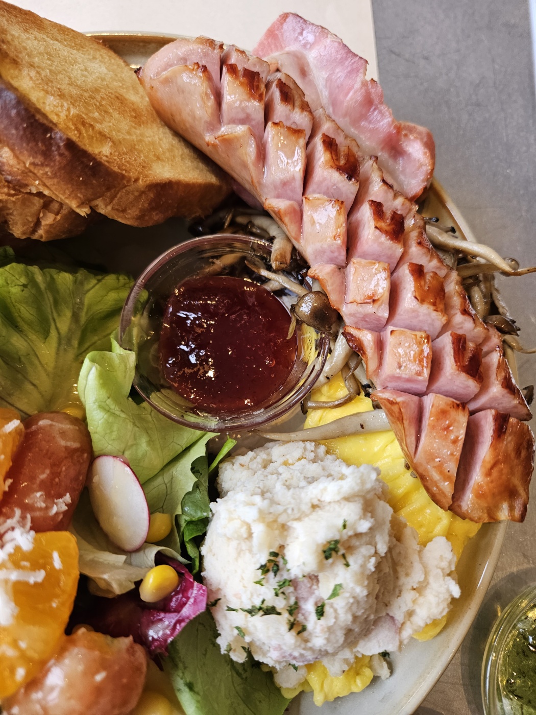 감자샐러드, 볶은버섯, 딸기잼 이렇게 있었어요.