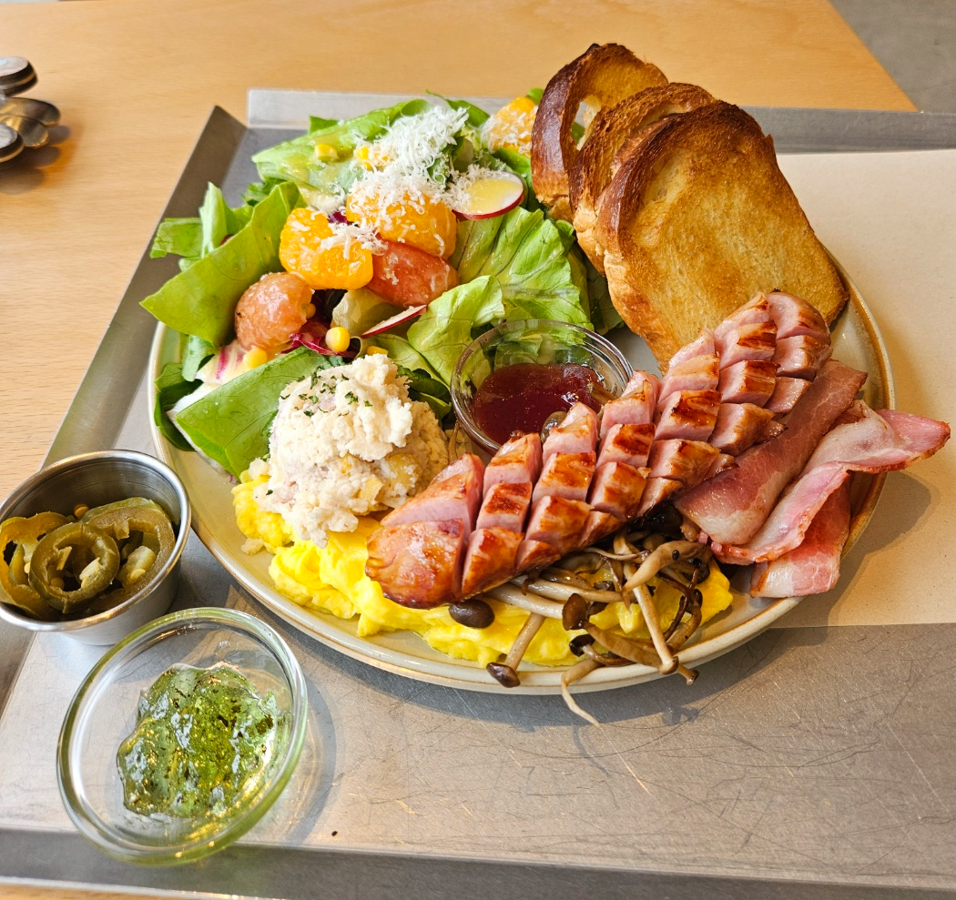 브리오슈토스트, 소세지, 베이컨, 스크램블에그