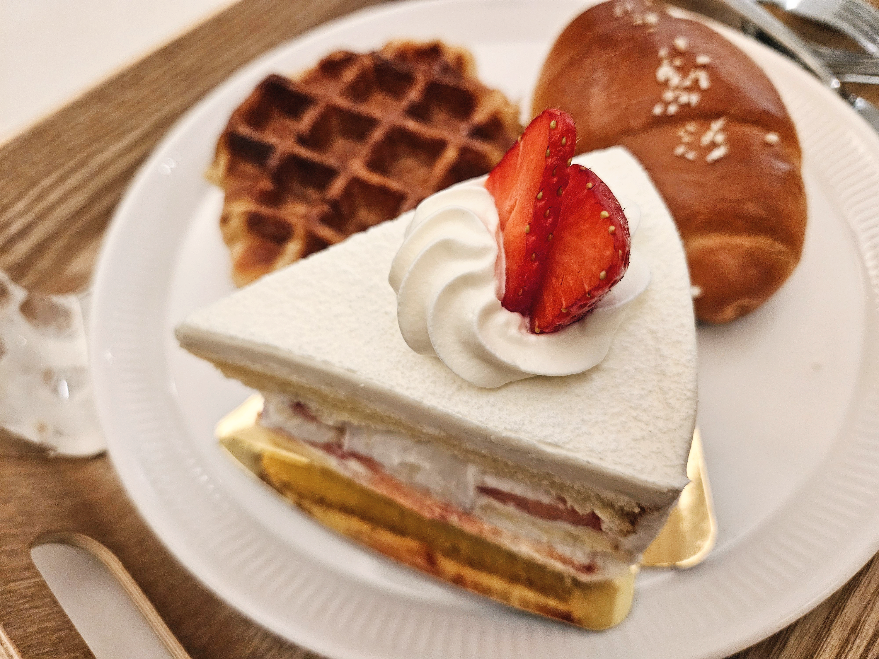 소금빵과 크로플, 그리고 생크림딸기케익이에요.