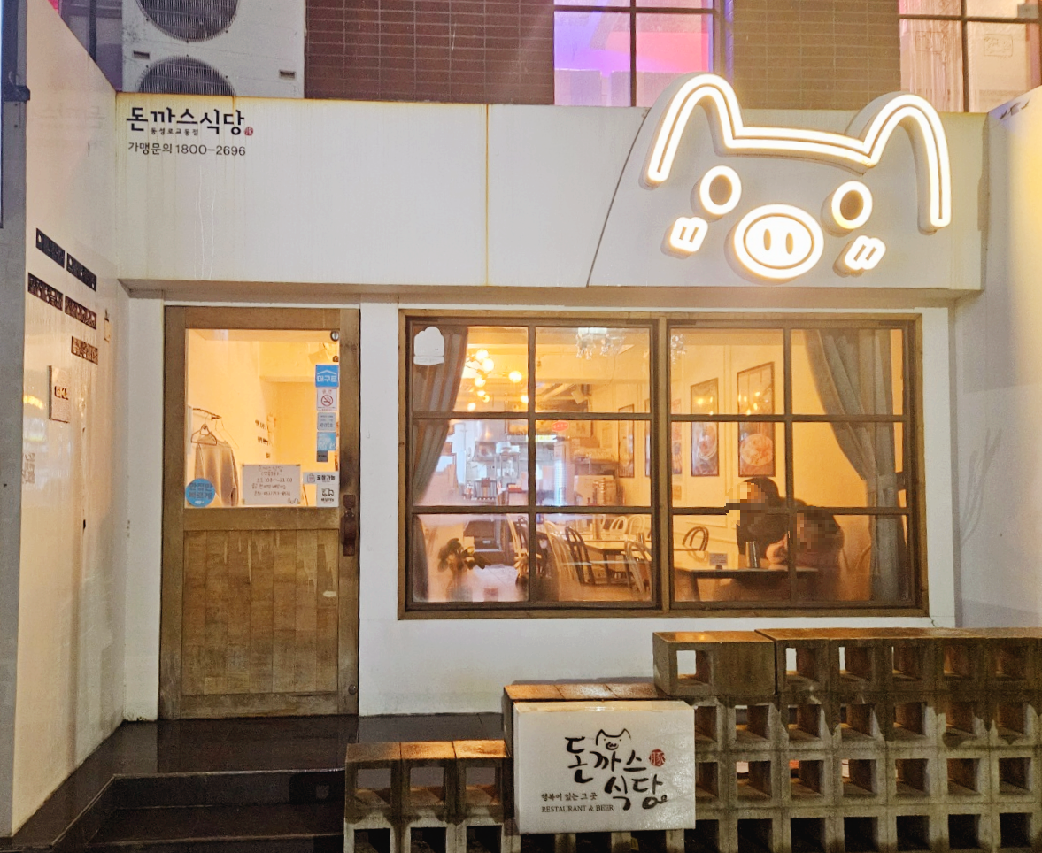 귀여운 돼지간판이 반짝이는 돈까스식당에