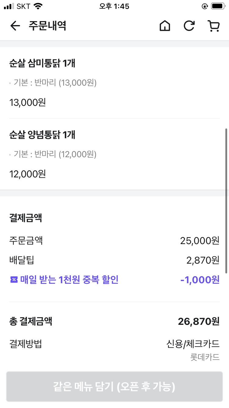통닭 메뉴를 모두 반 마리씩 주문이 가능해서