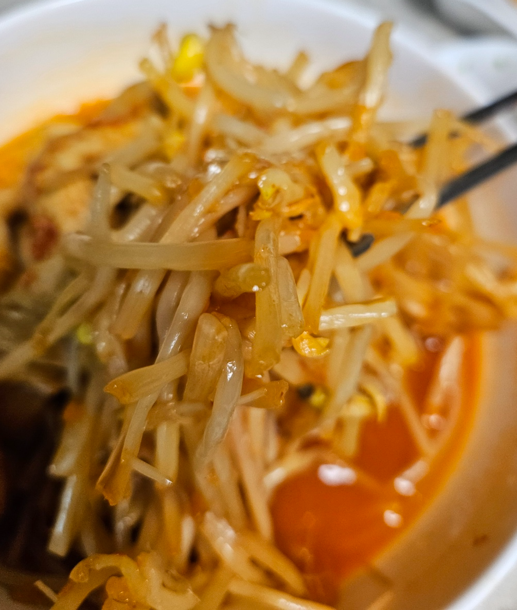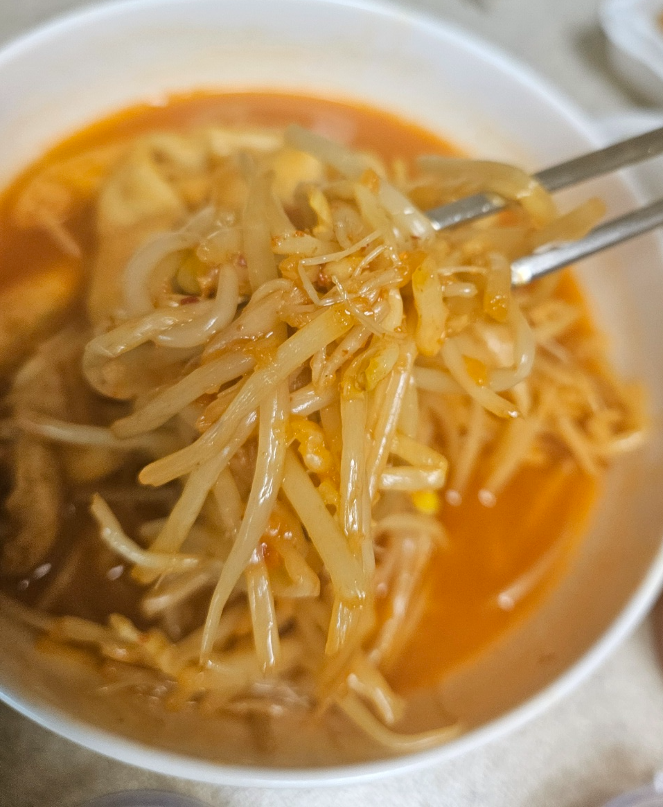 함께 주문한 매운오뎅의 콩나물을 얹어 먹으니