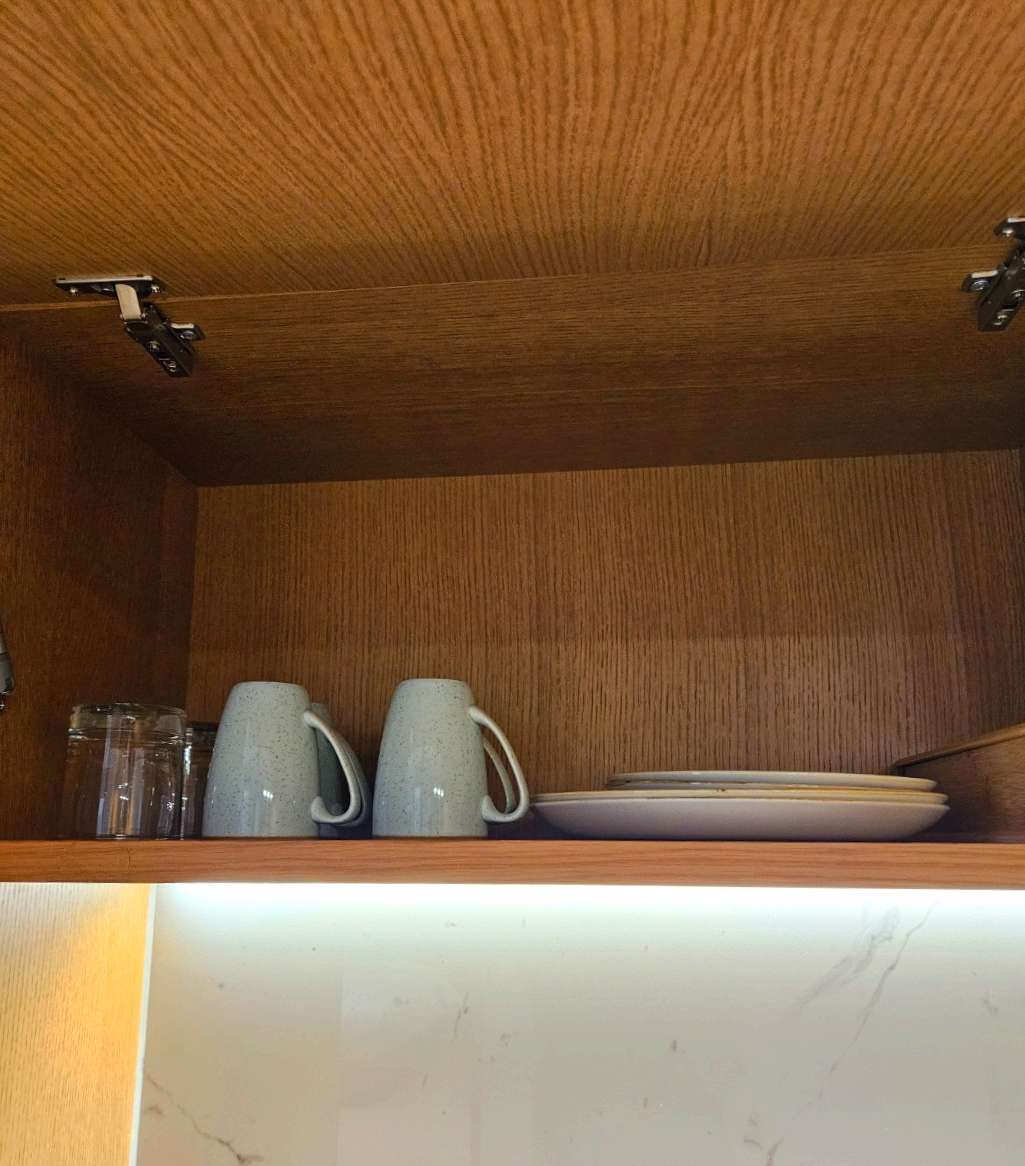 주방 위 선반쪽에는 컵과 접시, 숟가락과 젓가락