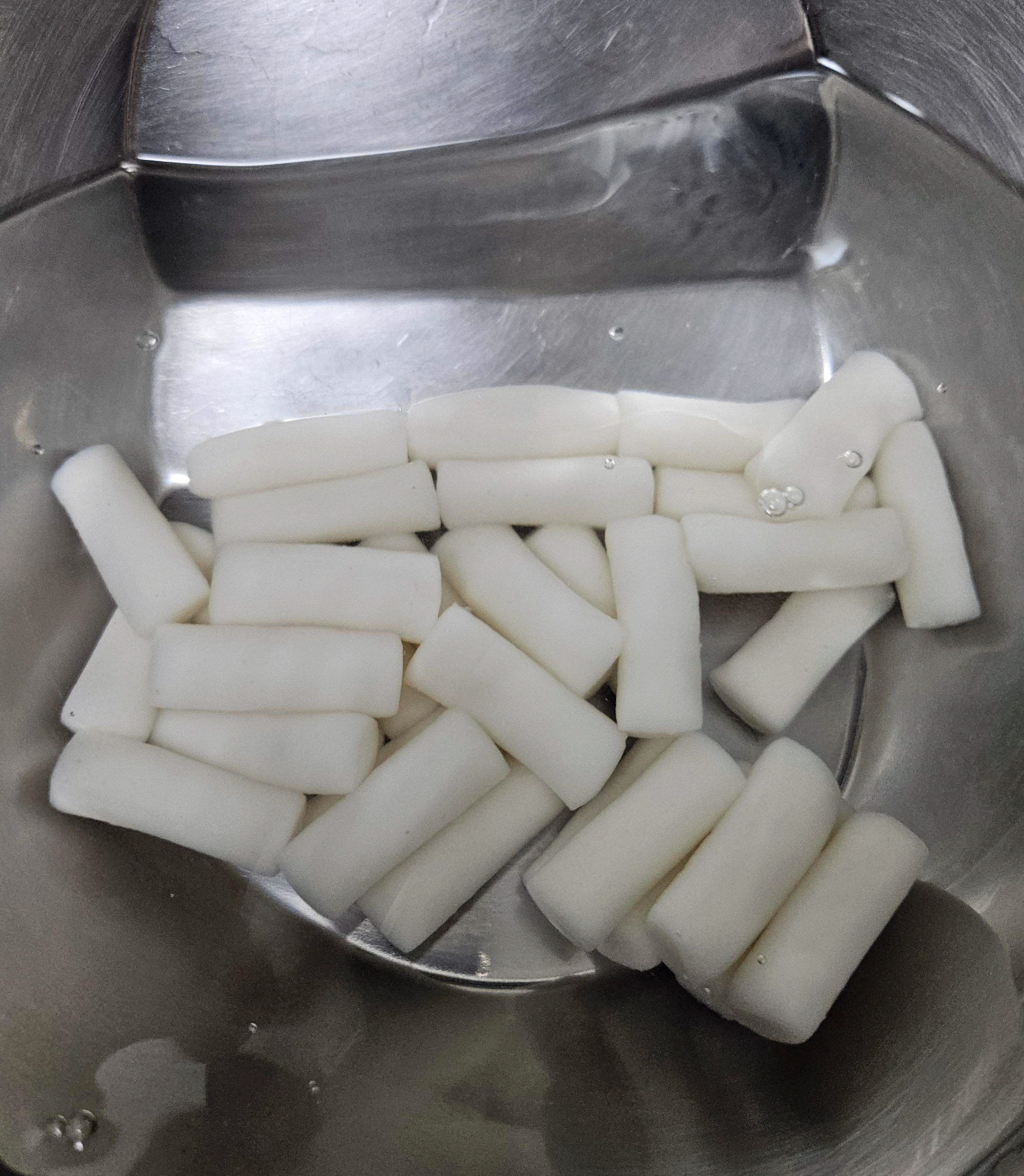 쌀떡을 찬물에 넣고 하나씩 떼어줬어요. ㅋㅋ