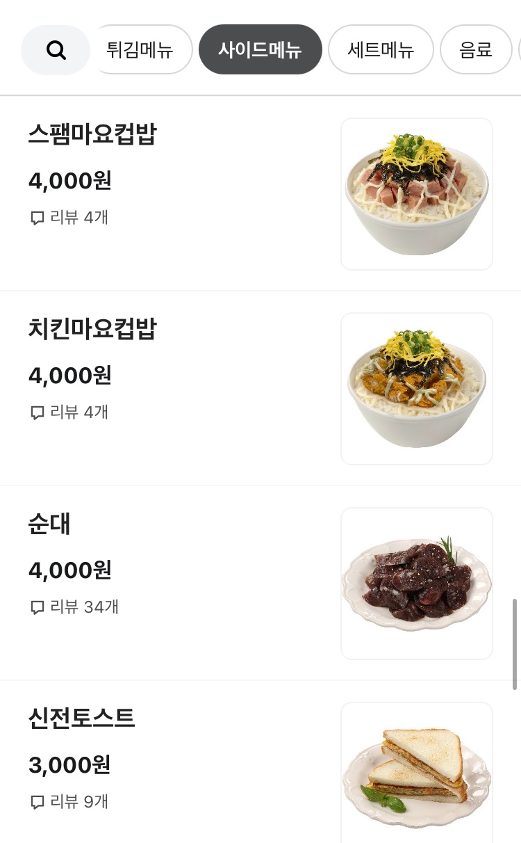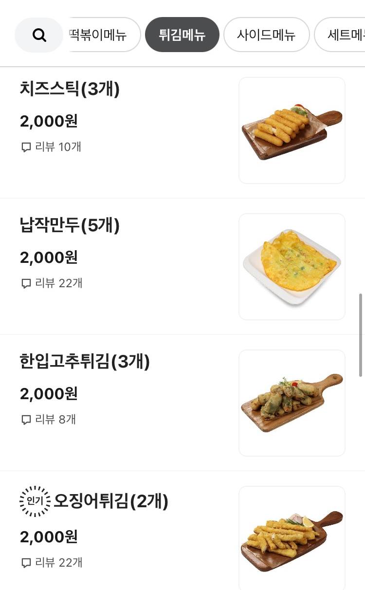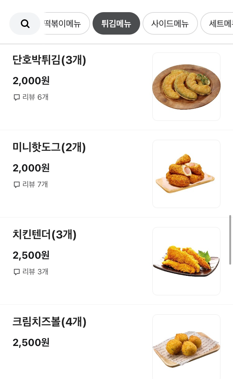 대부분 튀김메뉴는 2,000원~2500원사이에요.