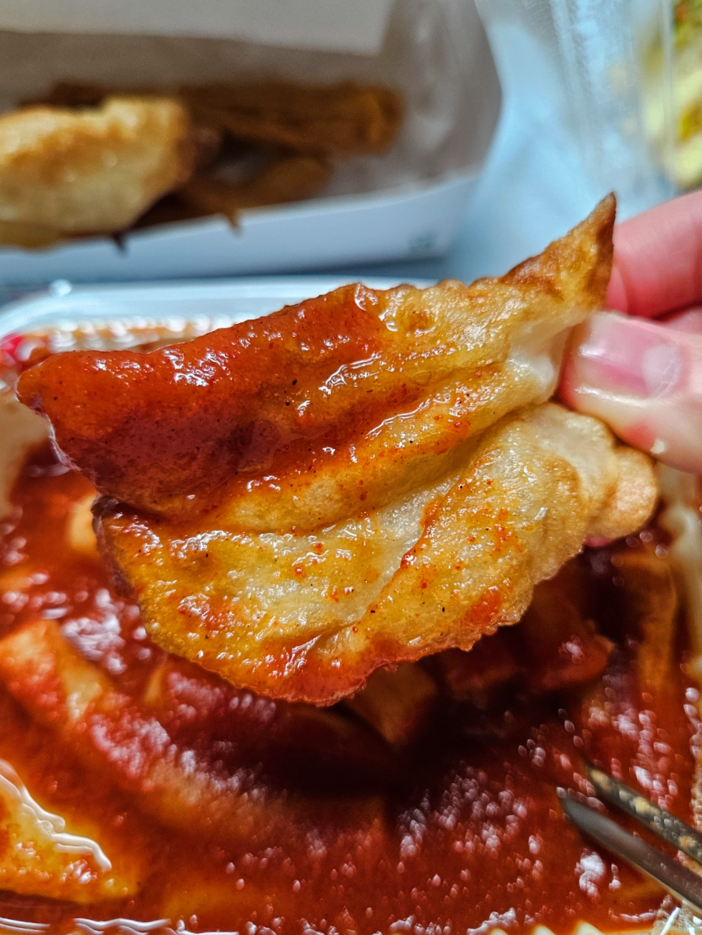 만두의 비어있는 속에 신전떡볶이 떡 하나 넣고 먹으면