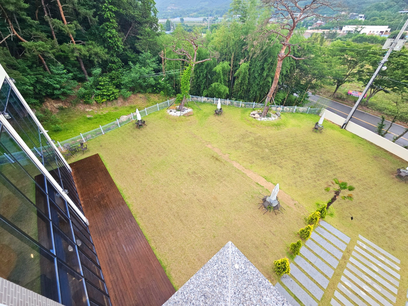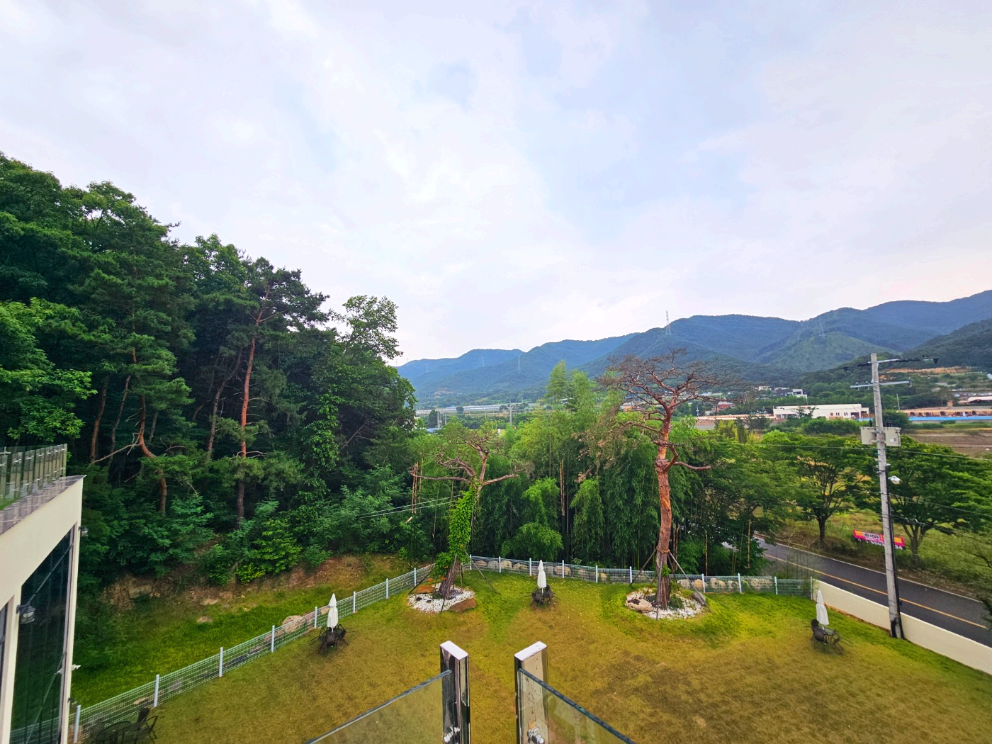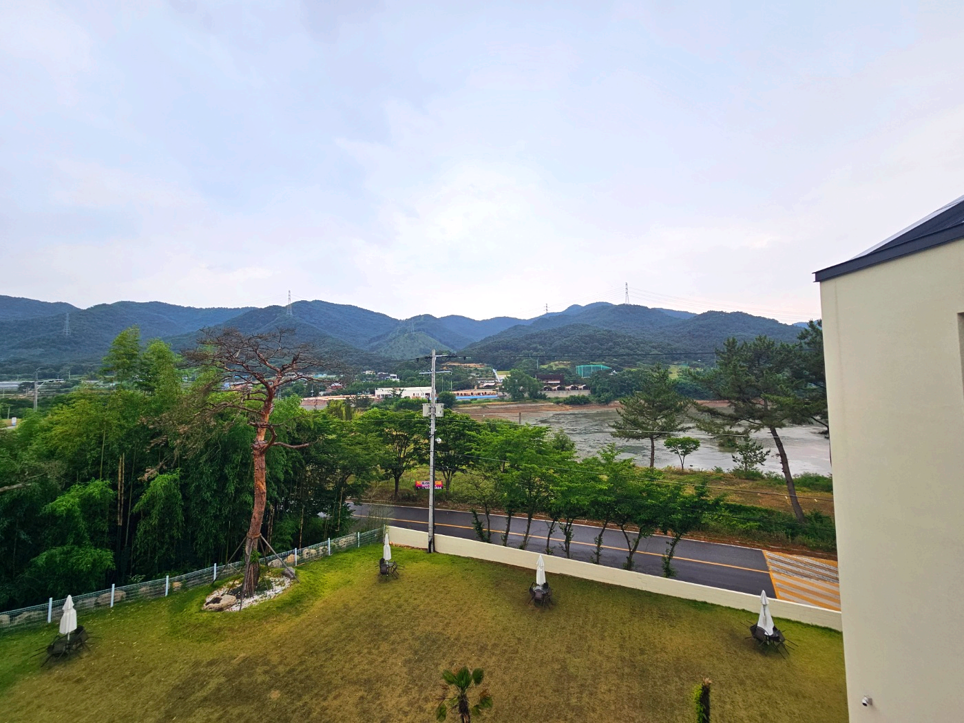 날씨가 좋은 날에 테라스에서 산과 강을 보는 것도