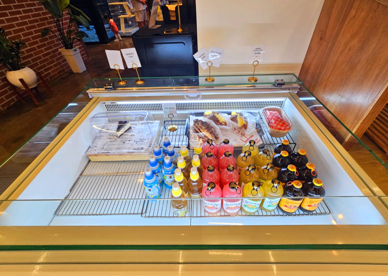 크로아상과 어린이 음료, 그리고 병주스도 있어요.