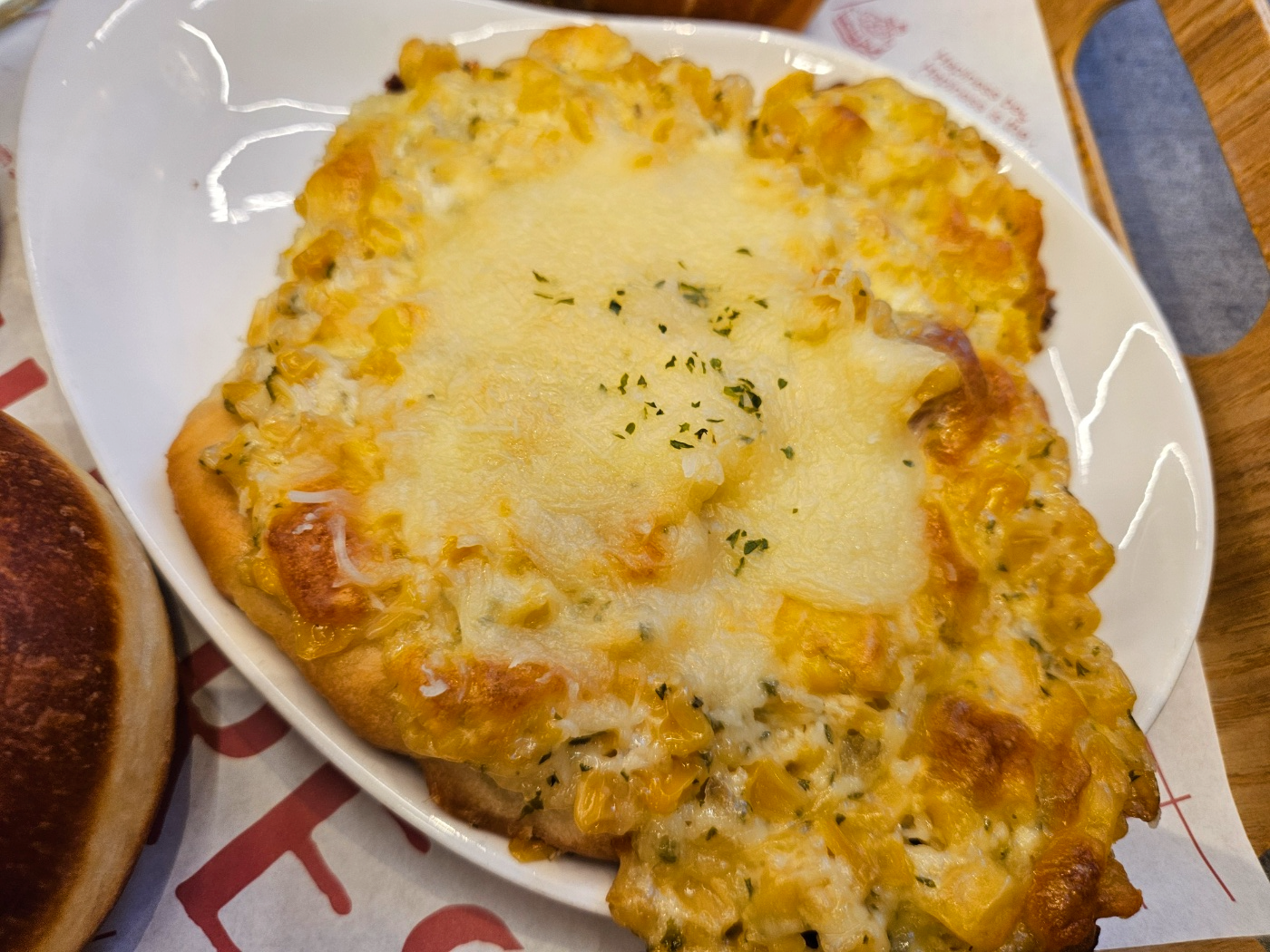 납작한 빵도우위에 옥수수와 치즈가 듬뿍 들어있던