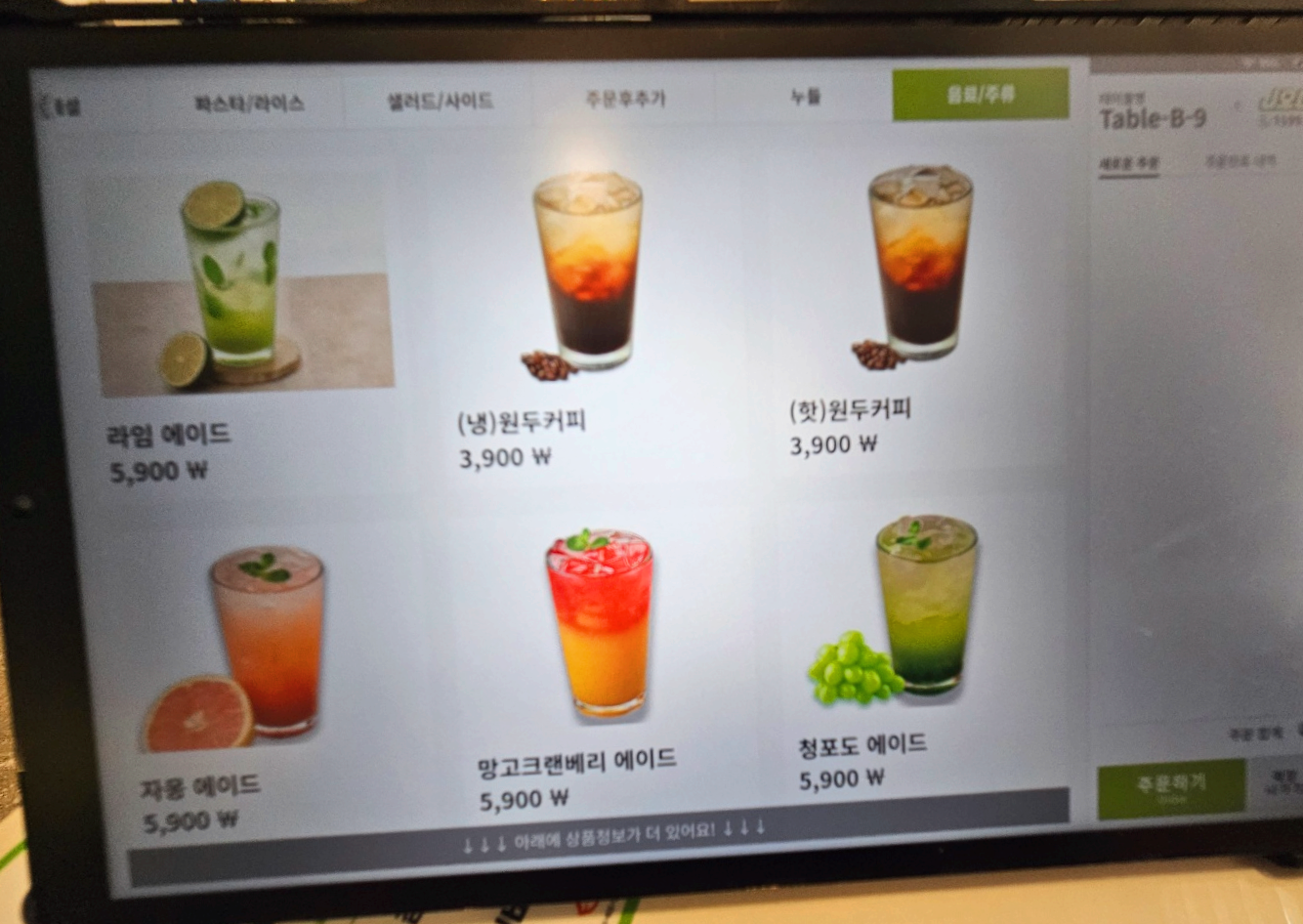 음료메뉴는 에이드와 탄산, 커피 등이 있답니다.