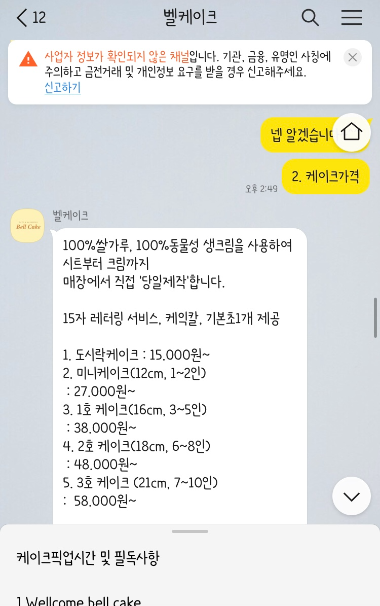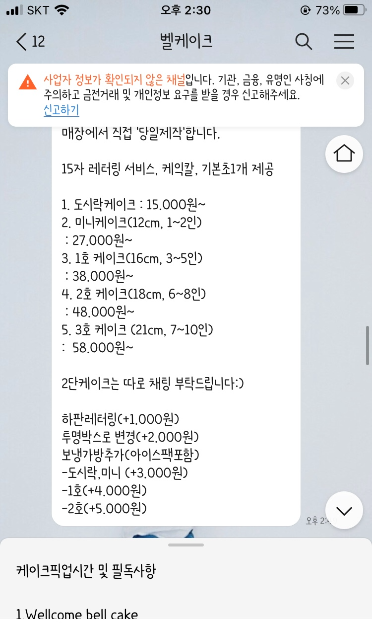 주문은 카카오톡채널에서 @벨케이크라고 검색하셔서