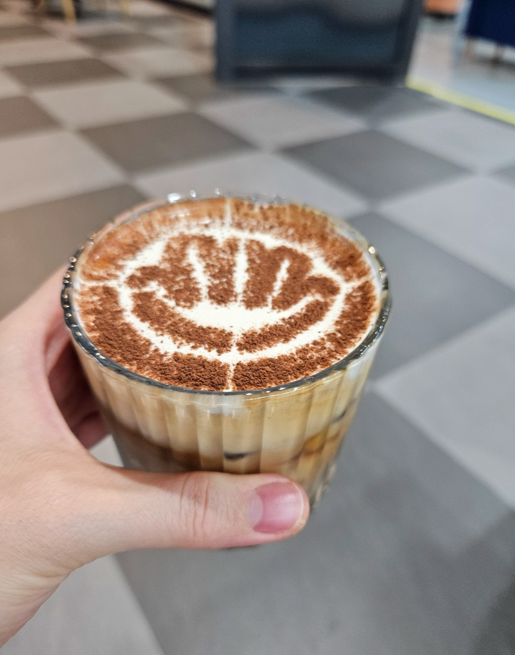 파우더가 뿌려져 있고, 아이스라떼위에 달달한