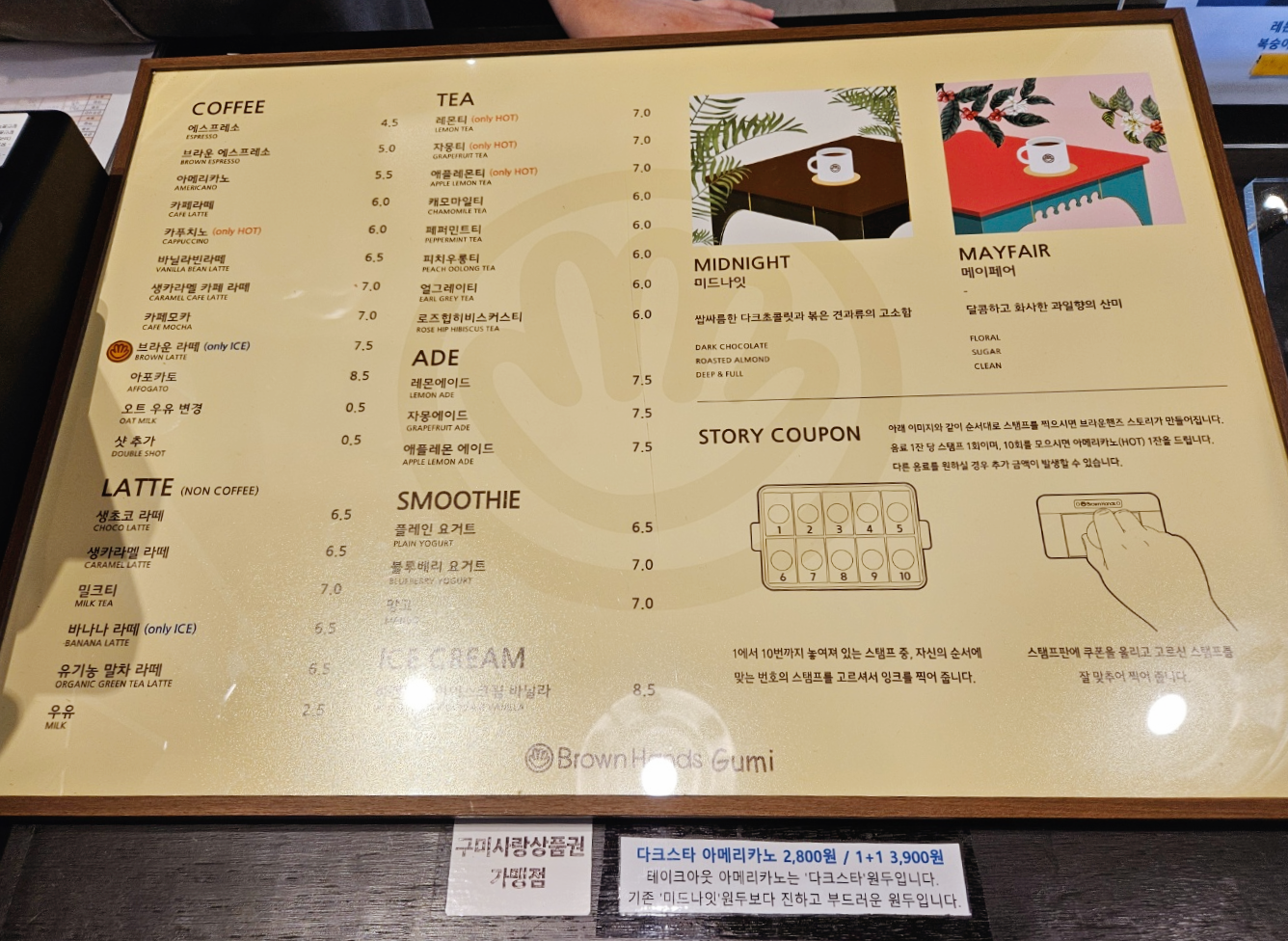 브라운핸즈 카페의 쿠폰 1번과 2번 스탬프를