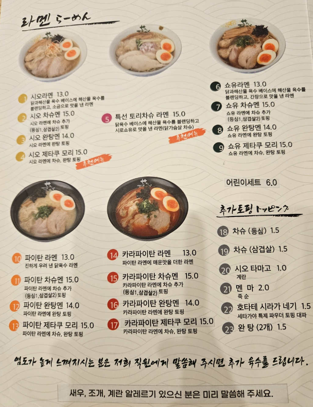 일본식 라면 맛집 일본세타카야 식당의 메뉴판이에요.
