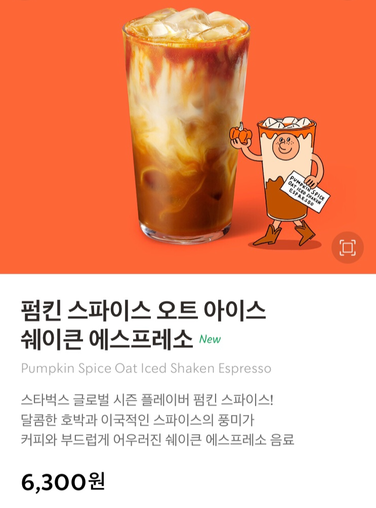 가격은 펌킨 스파이스 오트 아이스 쉐이큰 에스프레소 6,300원