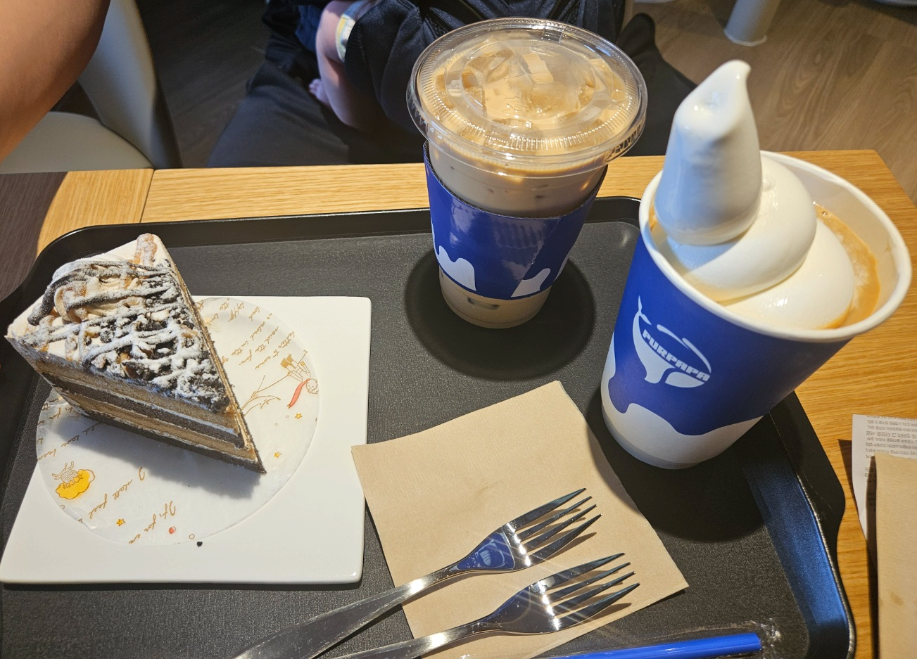 대구 수성구 범어역 카페 푸르파파 카페에서 주문한 메뉴에요. 푸르파파 카페는 다른카페에 비해서 커피가격이 많이 저렴한 편이었어요. 기본 따뜻한 아메리카노 가격이 1,500원이고 아이스아메리카노 1,900원이에요. 시그니처메뉴도 따로 있었어요. 저는 시그니처라떼 3,500원 카페라떼+아이스크림이 합쳐진 소프트라떼 3,500원 주문했어요. 그리고 조각케이크 6,500원 1개 주문했답니다.