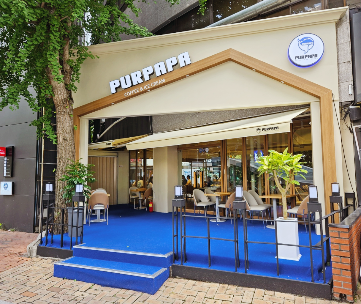 대구 수성구 범어동에 새로생긴 신상카페 푸르파파 범어네거리점이에요. 대구 지하철 2호선 범어역 2번출구 46m로 범어역과 아주 가깝게 위치하고 있어요. 푸르파파라는 이름은 푸르고 파란파도를 의미한다고 하네요. 그래서 그런지 파도처럼 카페바닥의 파란색이 눈에 띄었어요.