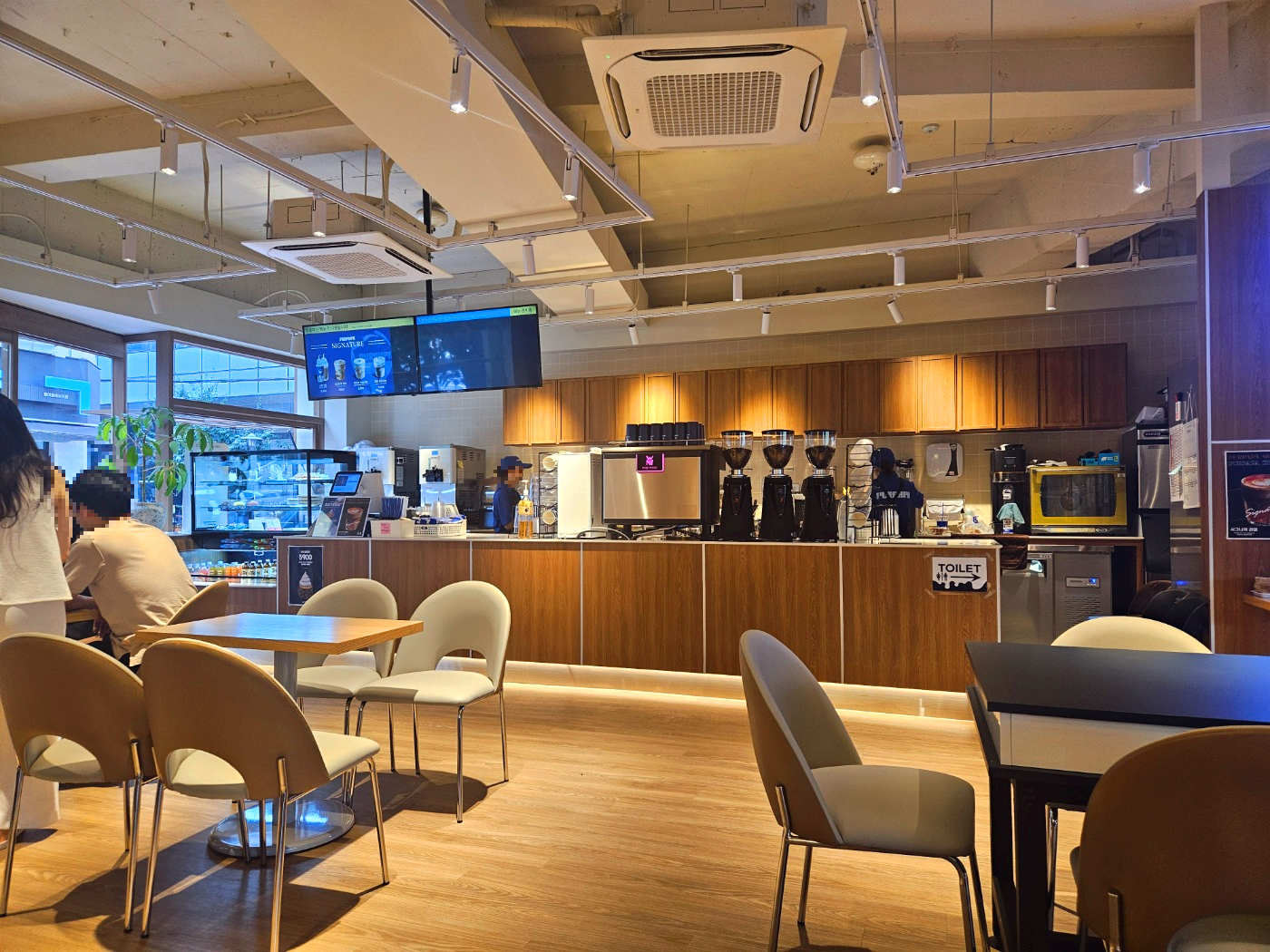 대구 푸르파파 카페 측면 소파자리에서 바라본 카페 내부 모습이에요. 베이지톤의 은은한 느낌의 인테리어로 편안함이 강조되는 분위기에요. 점심시간이후로 갔더니 포장손님도 꽤 많고 방문하시는 분들이 꽤 많았어요.