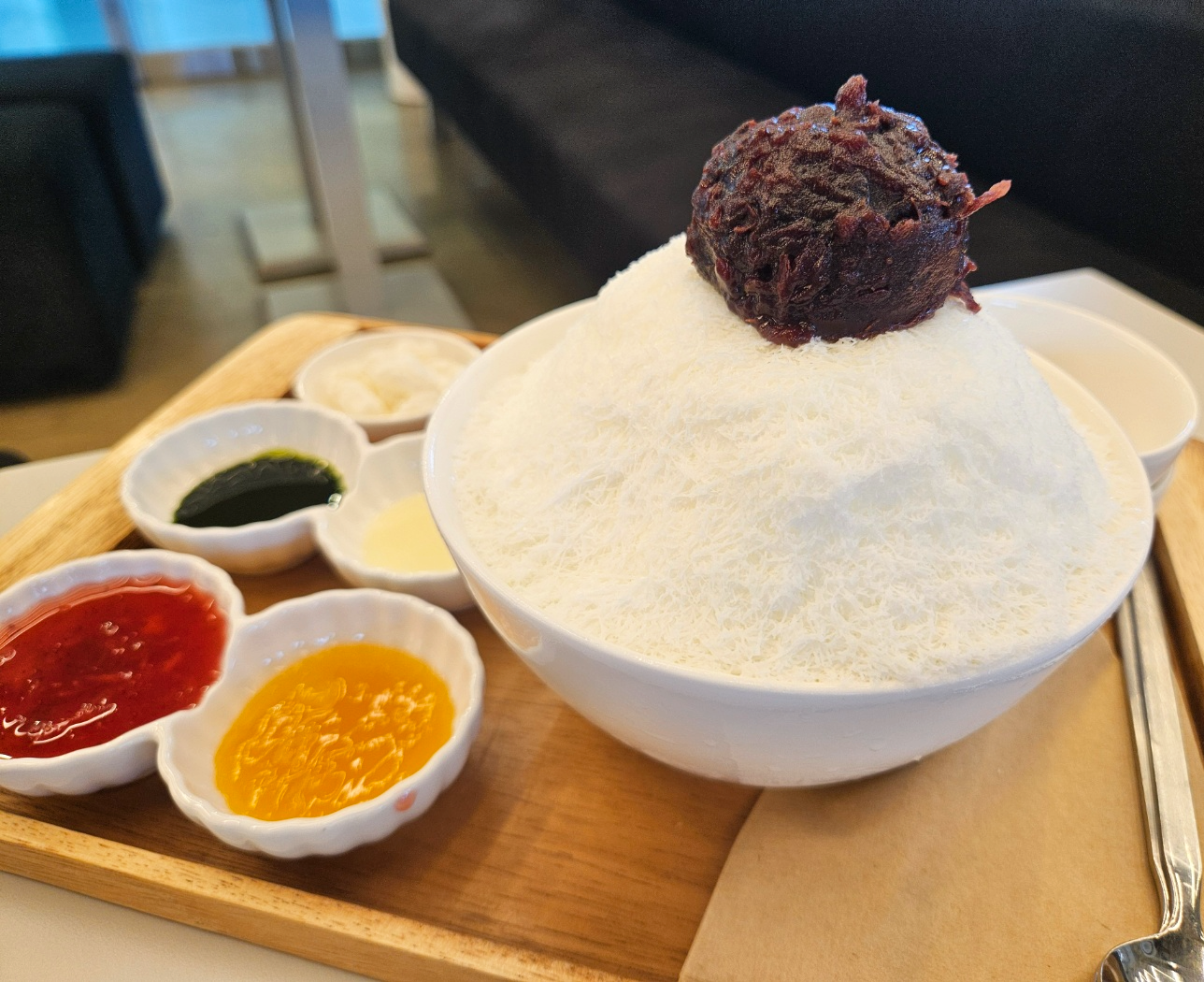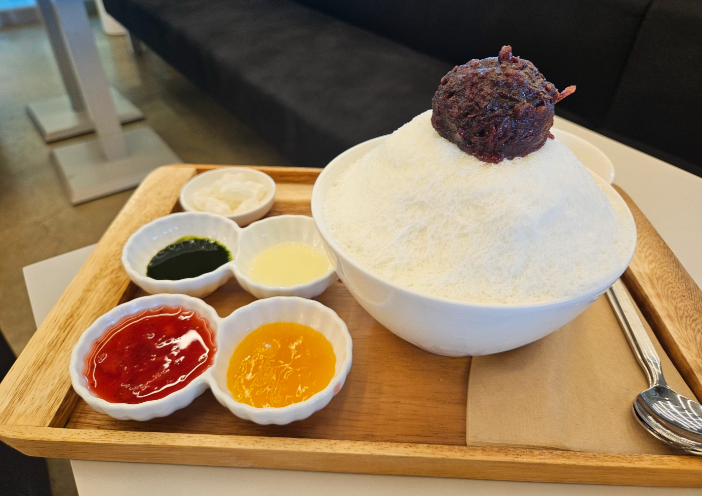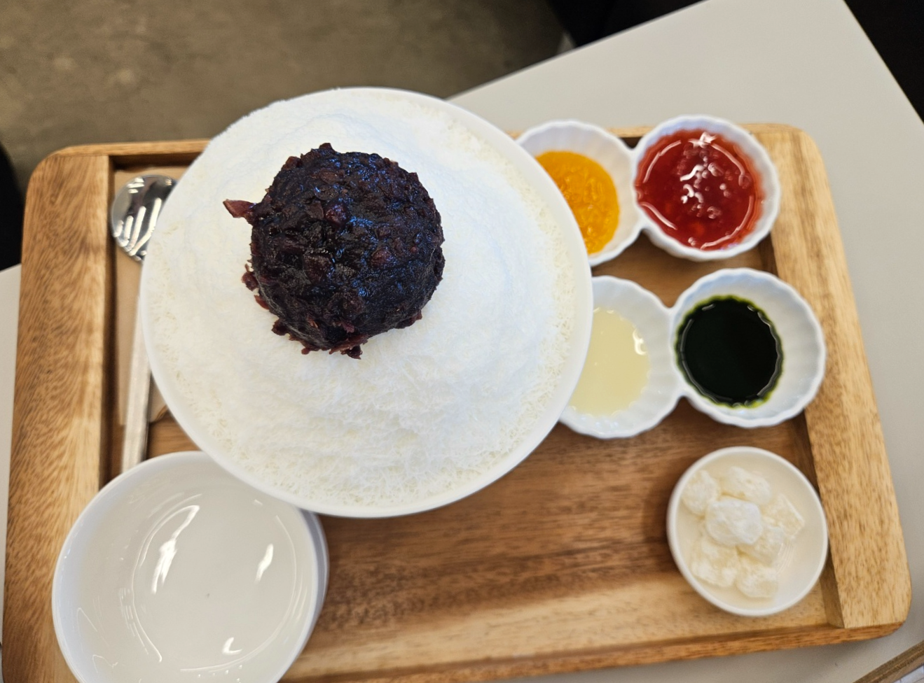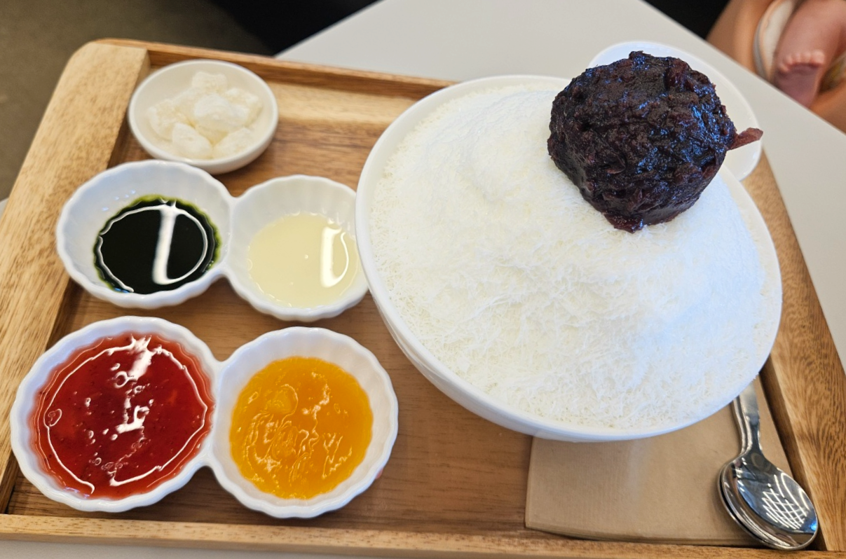 팥빙수에 들어가는 떡과 소스 4가지가 제공되어요. 조그마한 앞접시를 주시는데 거기에 덜어서 소스를 넣어 비벼서 먹으면 되는데 색다르기도 하고 한 번에 여러가지 맛을 볼 수 있어서 흥미롭게 먹었어요. ㅋㅋ