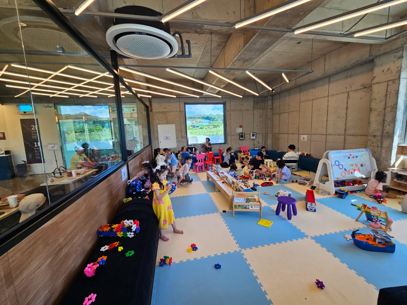 미끄럼틀과 그네 , 트램폴린이 있는건 아니였고 책과 아기자기한 장난감들, 색칠톨이, 블럭과 주방놀이 등 가지고 놀 수 있는 장난감들이 많이 있었어요. 색칠놀이할 때 티니핑색칠종이도 직원분이 직접 가져다 주셨어요. 저희 아이가 6세라 왠지 시시해하고 재밌게 놀까? 걱정했었는데 걱정과는 달리 너~무 재밌게 잘 놀았어요. ㅎㅎ 색칠놀이도 하고 블럭도 만지고 처음보는 친구와 친해져서는 정말 잘 놀아줘서 편하게 쉴 수 있었답니다.