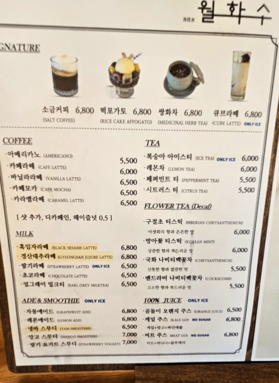 대구근교 경북 경산 놀이방있는 카페 월화수카페의 음료메뉴에요. 아메리카노 5,500원 카페라떼 6,000원이고 샷추가 및 디카페인으로 변경 가능해요. 흑임자라떼와 경산대추라떼, 냉마 스무디 등 시그니처메뉴가 따로 있는 듯 했어요.