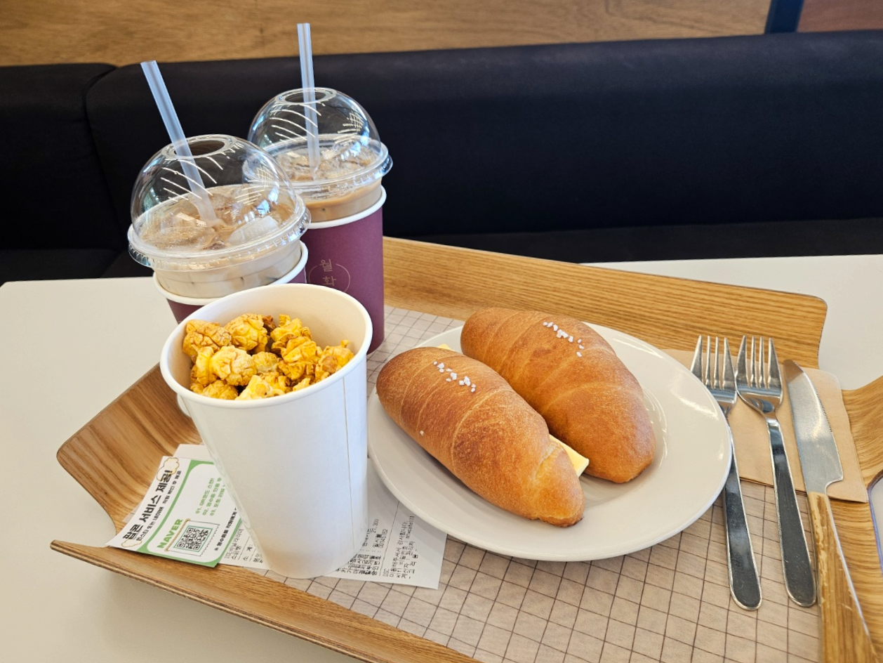 우선 월화수카페에서 1차적으로 주문한 메뉴 아이스바닐라라떼와 카야잼버터소금빵, 그냥 소금빵이에요. 카라멜팝콘은 큰컵 기준 5,000원에 구매하실 수 있고 주문을 하시면 서비스로 팝콘을 컵에 조금 담아주셔요. 네이버에 영수증리뷰를 하시면 팝콘을 서비스로 한컵 더 받으실 수 있어요.