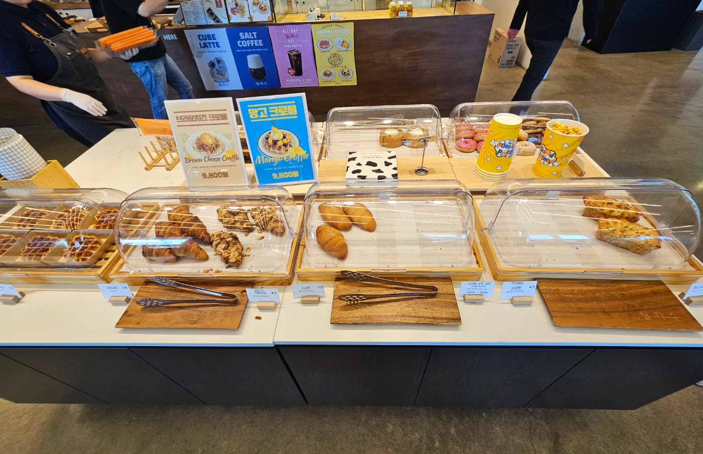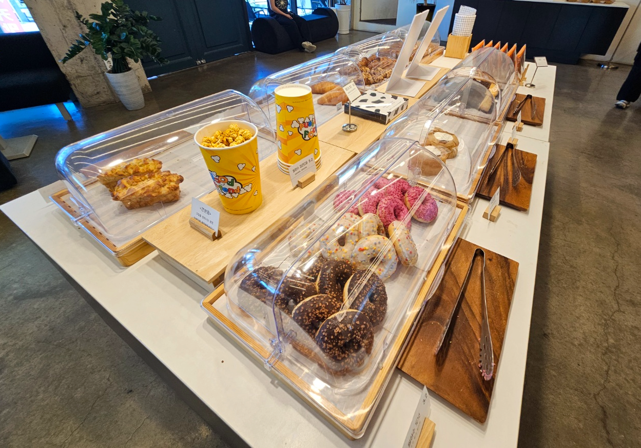 빵종류는 엄~청 많지도 적지도 않고 적당하게 있었어요. 소금빵, 크로플, 크루아상, 식빵, 도넛, 카스테라와 빨미까레, 크루키 등 인기많은 빵들로만 구성되어 있었고 카라멜팝콘도 판매하고 있었어요.