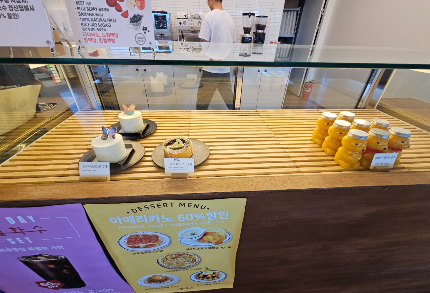그리고 오른쪽에 곰돌이 모양의 보틀에 판매하는 착즙 100% 오렌지주스와 우유케이크, 치즈케이크 등이 있어요. 아기들이 마실 뽀로로음료같은 어린이음료는 없었지만 착즙100% 과일주스가 있어서 아이들이 먹기에 괜찮았어요.