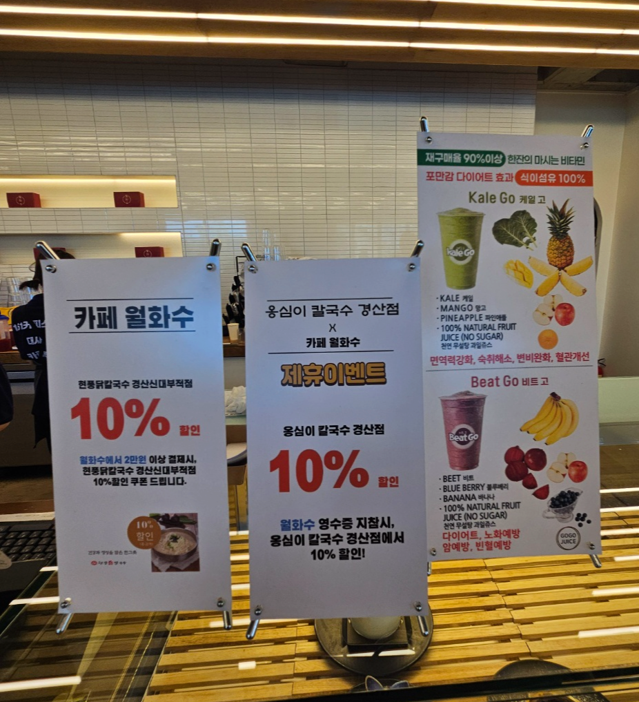 그리고 카페 월화수에서 2만원 이상 결제하시면 현충닭칼국수 경산신대부척점에서 10% 할인받으실 수 있는 쿠폰을 받으실 수 있고 경산 대형카페 월화수카페 옆에 위치한 옹심이 칼국수 경산점에서는 영수증을 제시하시면 10% 할인받으실 수 있어요.