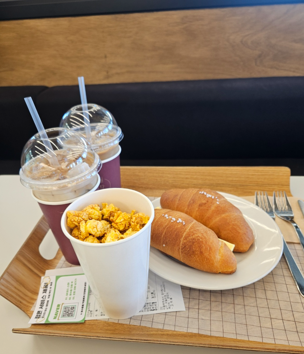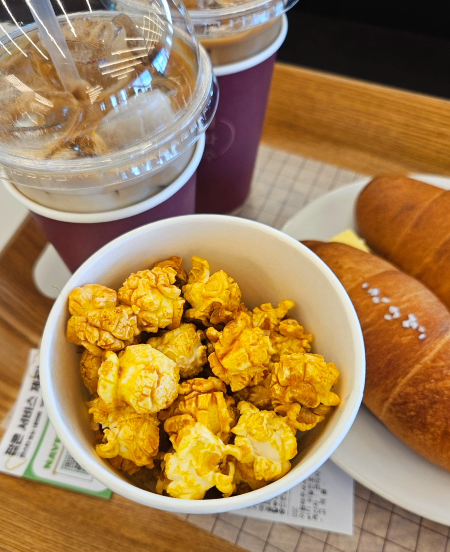 아이스바닐라라떼는 너무 달지않았고 또 인공적인 저렴한 바닐라시럽 맛이 아니였어요. 부드러우면서도 적당히 달달하니 괜찮은 맛이었어요. 소금빵은 그냥 평범한맛! 카야잼버터 소금빵이 그냥 소금빵보다 훨씬 맛있었어요. 그리고 서비스로받은 팝콘은..진짜 왠만한 영화관팝콘보다 훨~~~씬 맛이 좋았어요. ㅋㅋ 가게에서 직접 팝콘을 만들어주시는데 어쩜이리 맛있는지ㅠㅠ 여기 진짜 팝콘 맛집이에요!