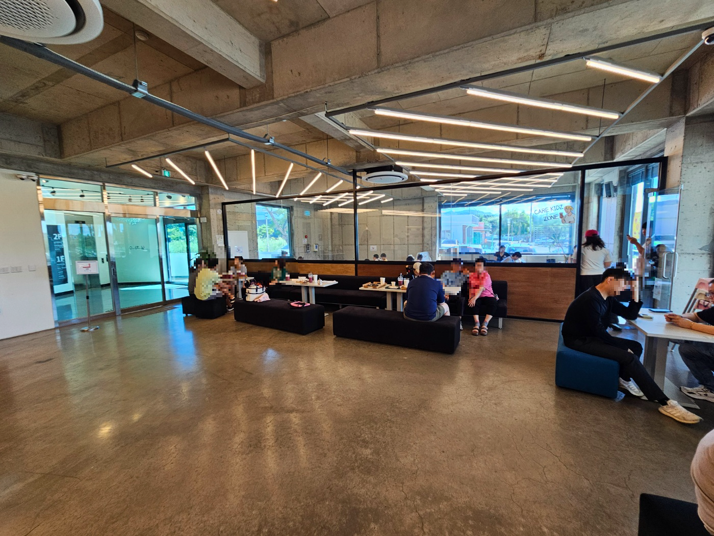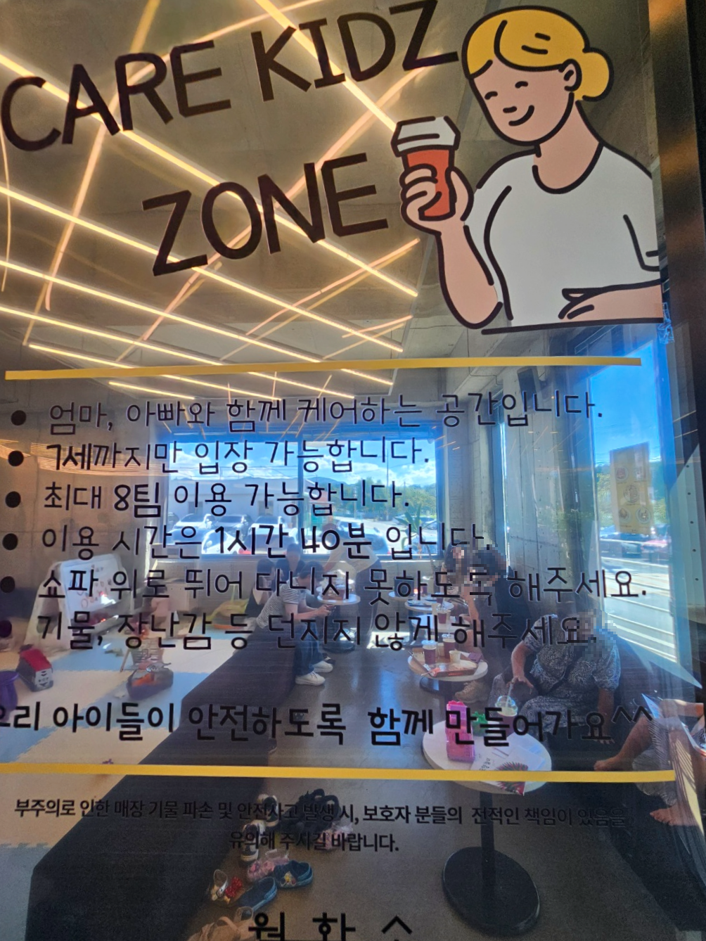 1층에 케어키즈존이라고 해서 따로 아이들이 놀 수 있는 키즈존이 있어요. 키즈존에도 좌석과 테이블이 있어서 앉아서 음료와 디저트를 먹으면서 아이를 보실 수 있어요.
