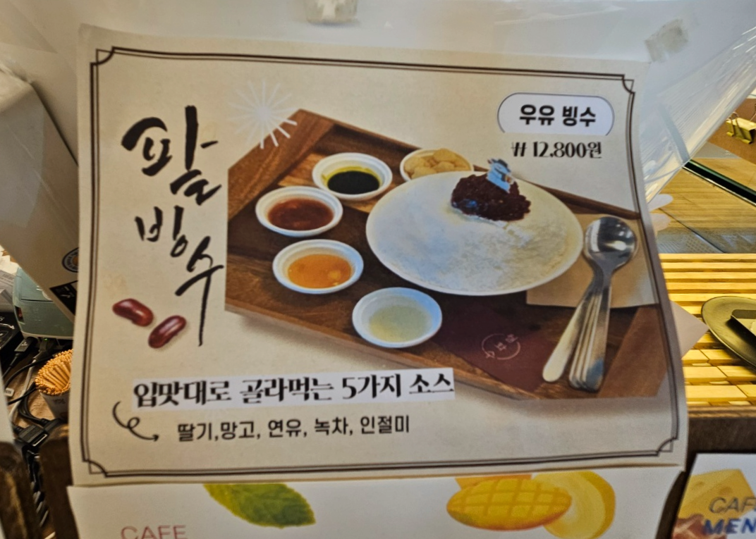 그리고 입맛대로 골라먹을 수 있게 5가지 소스가 함께 나오는 우유빙수도 판매하고 있어요. 월화수카페의 우유빙수 가격은 12,800원이에요. 다른 곳의 빙수와는 사뭇 다른 재미진 모습의 빙수였어요.