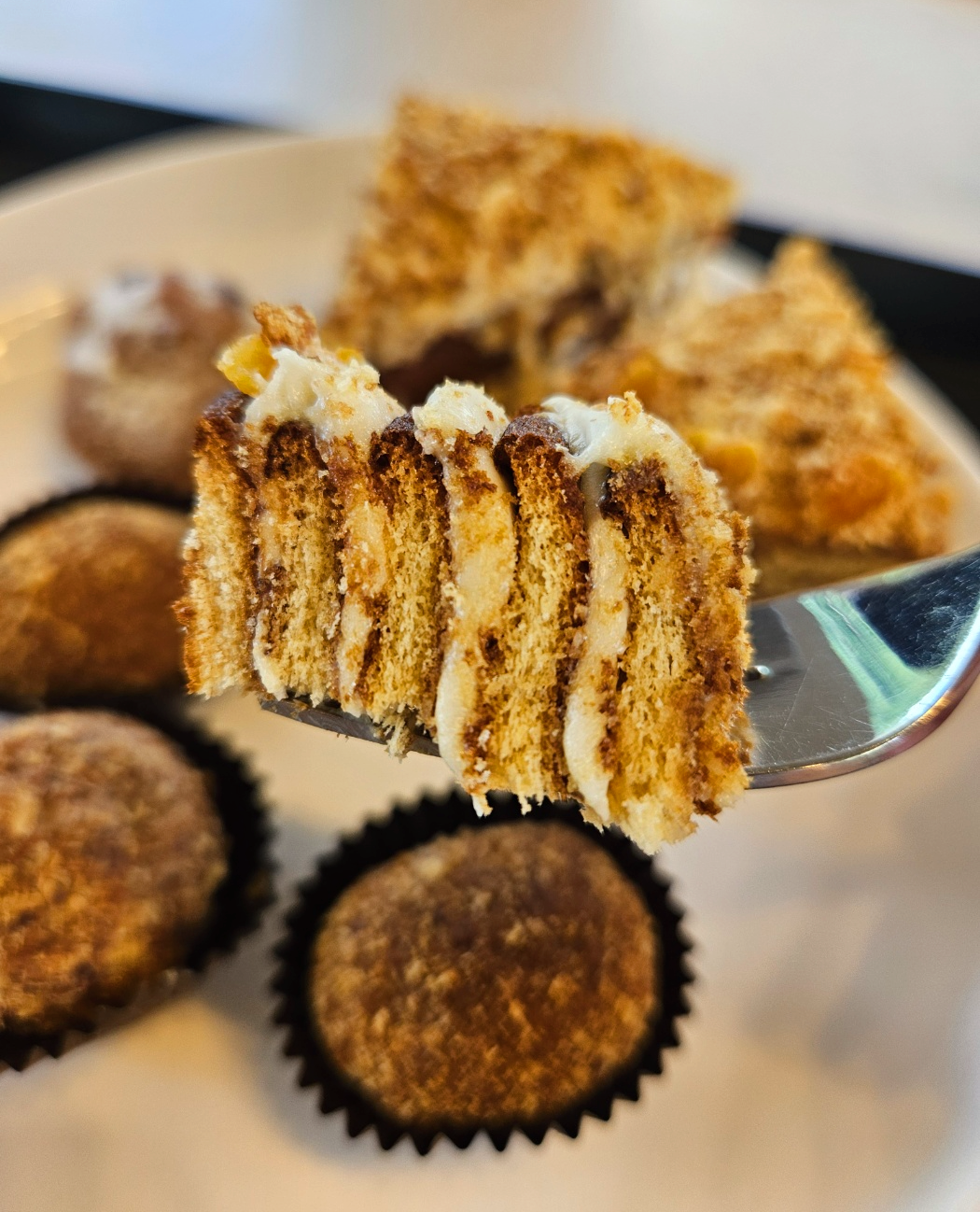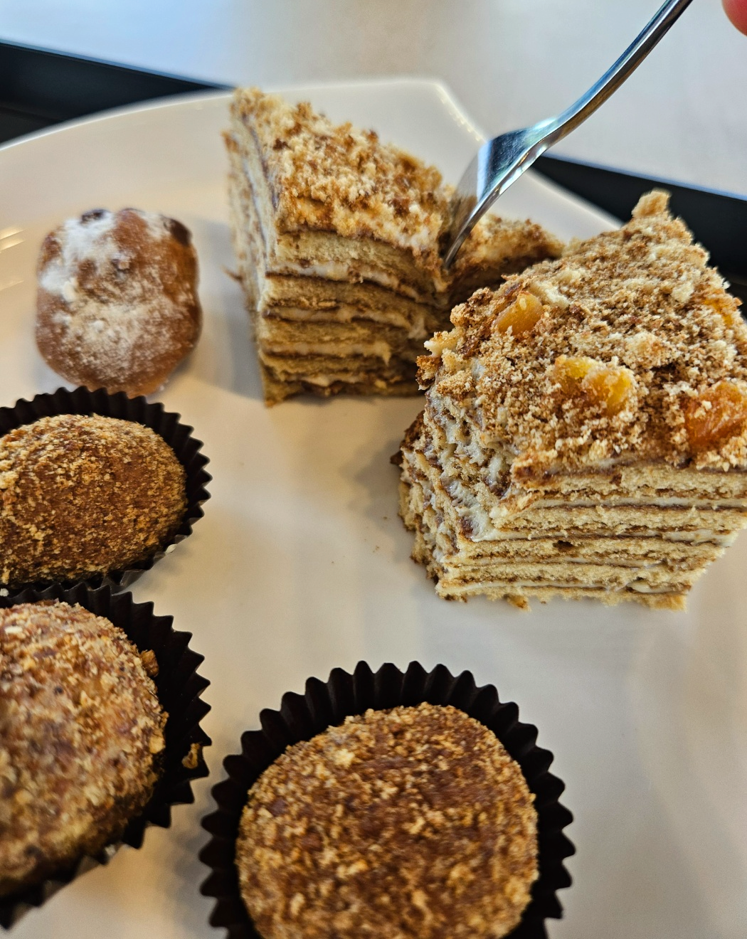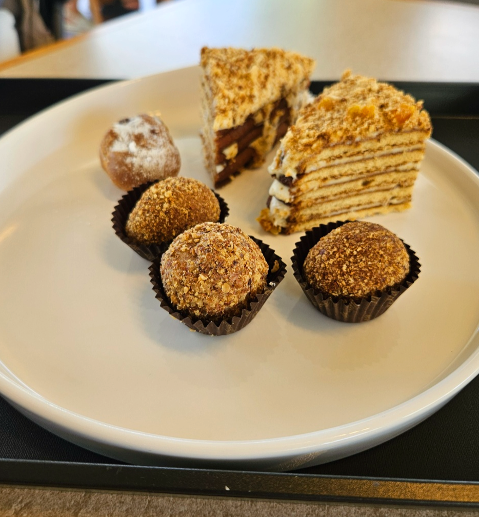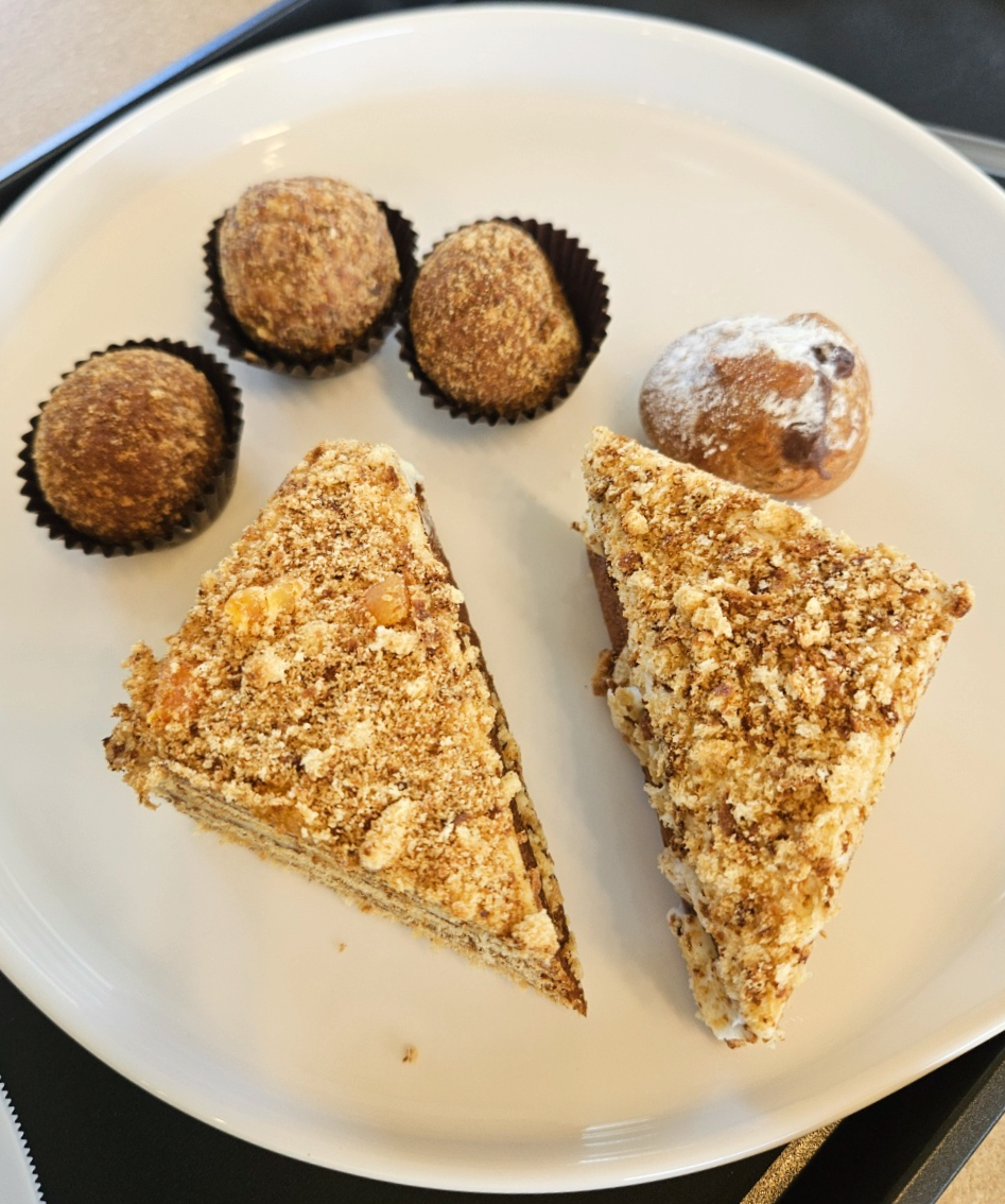 마렌카허니케이크는 많이 달지 않고 고소하면서 꿀맛이 느껴졌어요. 견과류맛의 고소한맛이 강하게 느껴졌고 식감은 찰지면서 살짝 쫀득한 느낌도 들고 부드럽기도 했어요. 다른 베이커리카페에서는 흔히 맛 볼 수 없는 고급진 맛이 느껴지더라고요.