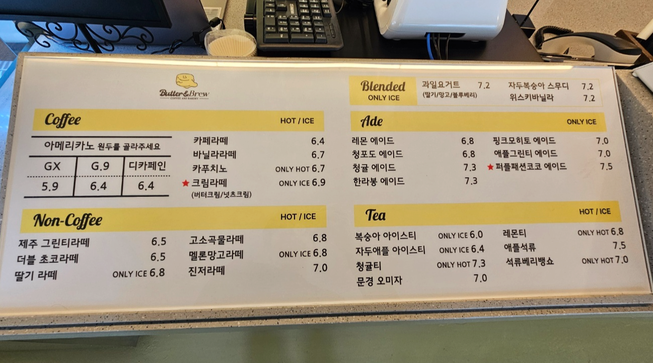 팔공산 버터앤브루 대형베이커리카페의 메뉴판이에요.