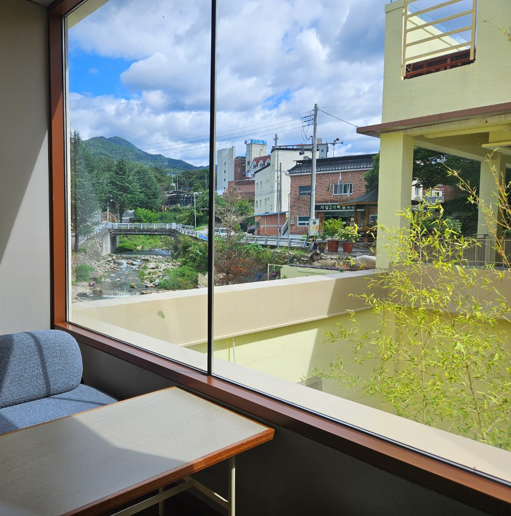 팔공산 신상 초대형 베이커리카페 버터앤브루 2층카페에서 바라본 계곡모습이에요.