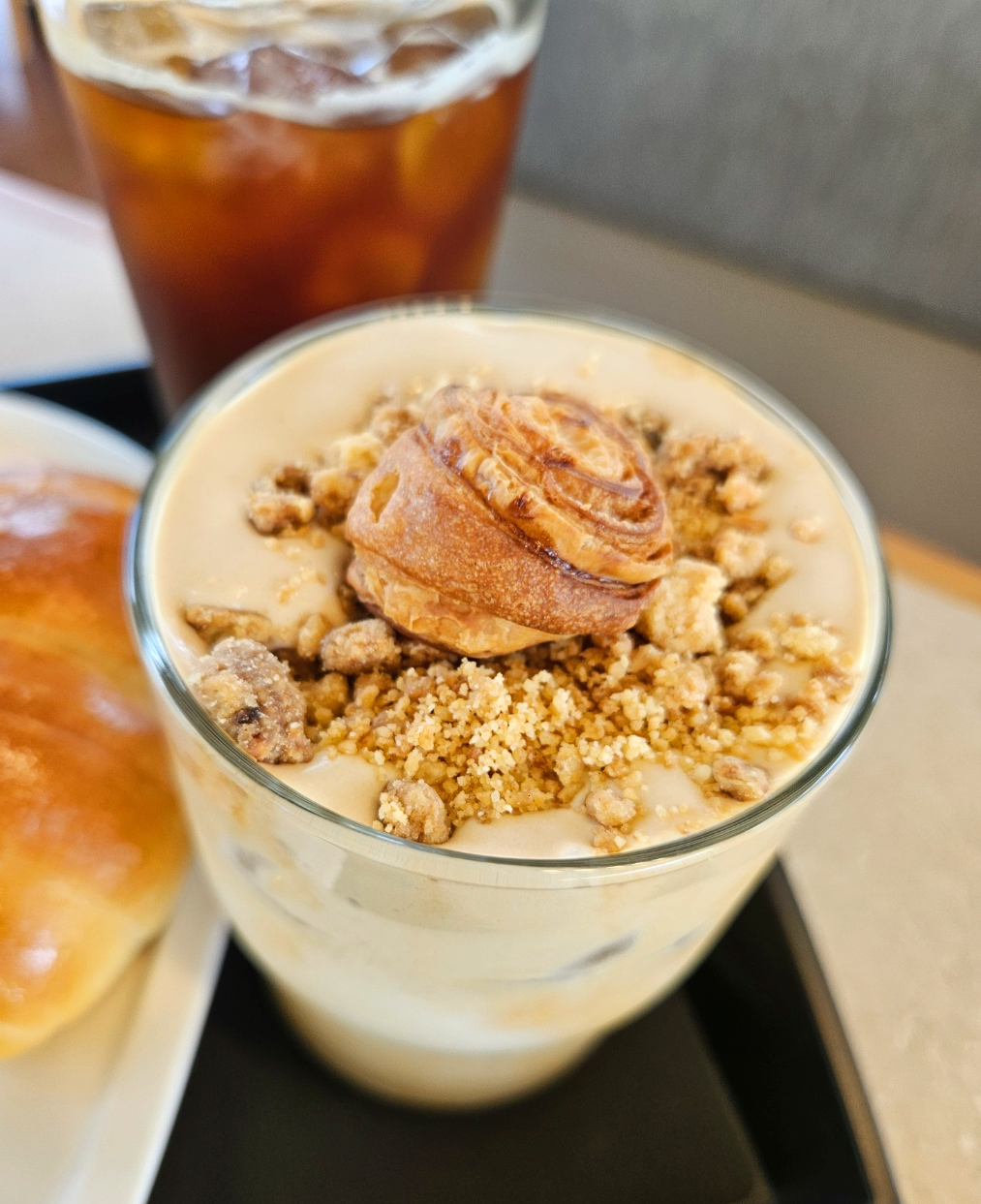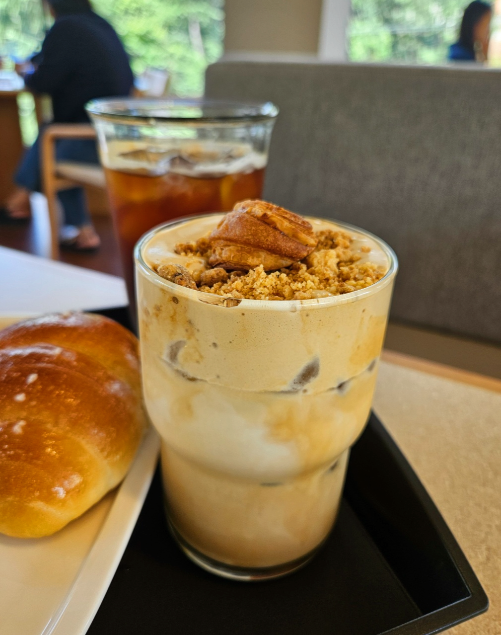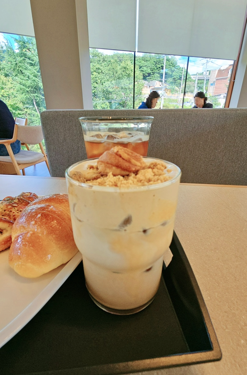 라떼위에 고소한 크림과 견과류가 토핑되어 있고 중간에는 크루아상?같은 빵조각이 올려져 있었어요.